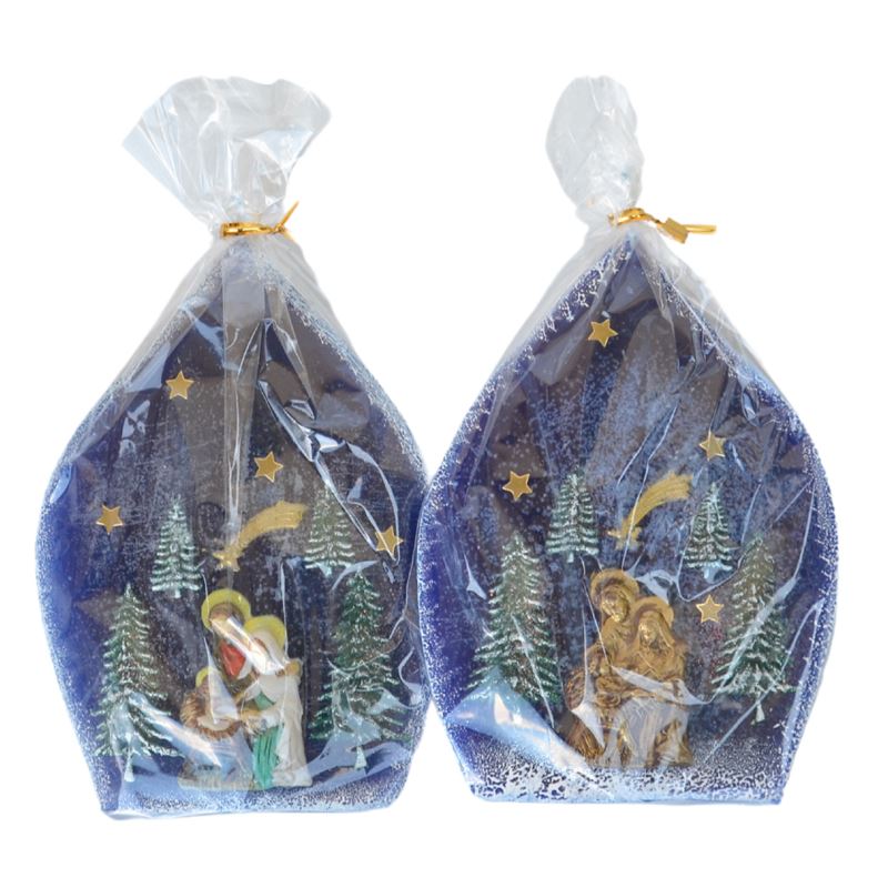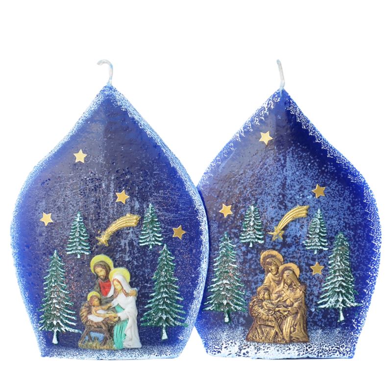 Świeca ozdobna bożonarodzeniowa w kształcie łezki z wizerunkiem Świętej Rodziny. Wysokość świecy 17 cm, szerokość świecy 12.7 cm.