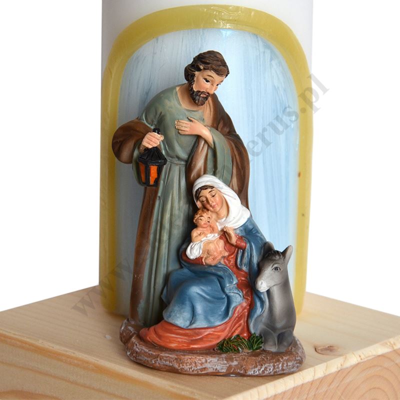 Świeca bożonarodzeniowa z figurką Świętej Rodziny. W świecy wbudowany jest dodatkowo światłowód, który w momencie palenia się świecy sam daje naprzemiennie blask w trzech kolorach oświetlając Świętą Rodzinę. Świeca zapakowana w celofanowy woreczek z dołączonym siankiem oraz karteczką z życzeniami bożonarodzeniowymi. Wysokość świecy 24 cm, wysokość figurki Świętej Rodziny 11 cm, szerokość podstawy 13 cm, głębokość podstawy 13 cm.