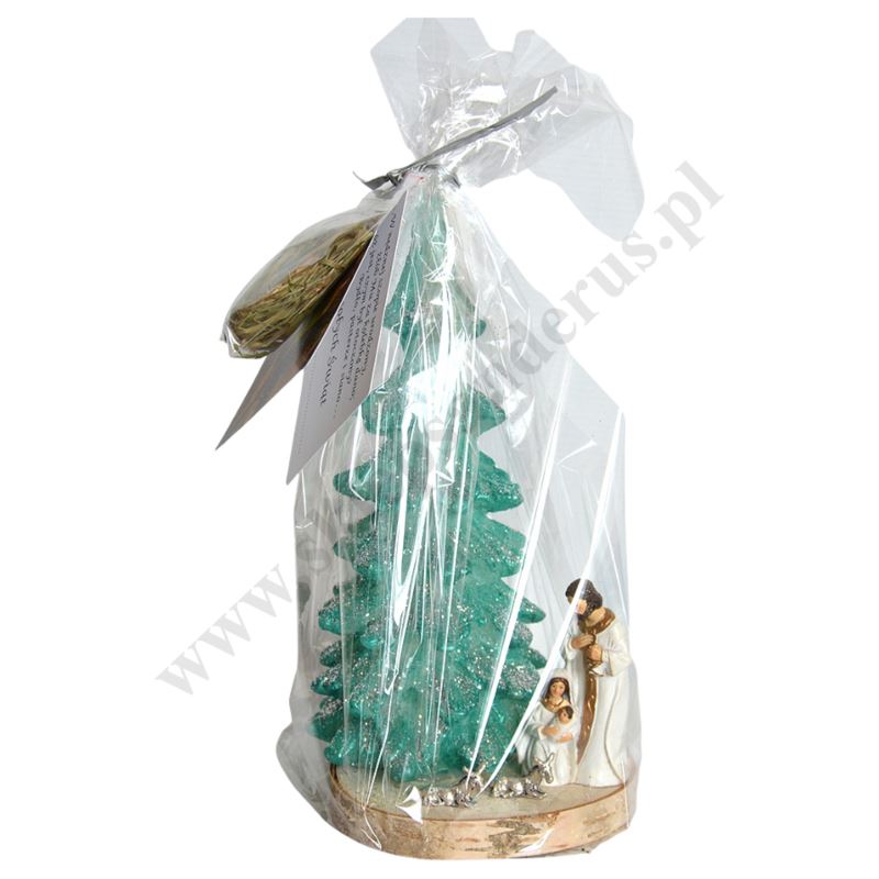 Świeca bożonarodzeniowa w kształcie choinki z figurkami Świętej Rodziny. W świecy wbudowany jest dodatkowo światłowód, który w momencie palenia się świecy sam daje naprzemiennie blask w trzech kolorach. Świeca zapakowana jest w celofan z dołączonym siankiem oraz karteczką z bożonarodzeniowymi życzeniami. Wysokość świecy 24 cm, wysokość figurki Świętej Rodziny 8 cm, średnica podstawy ok. 11 cm.