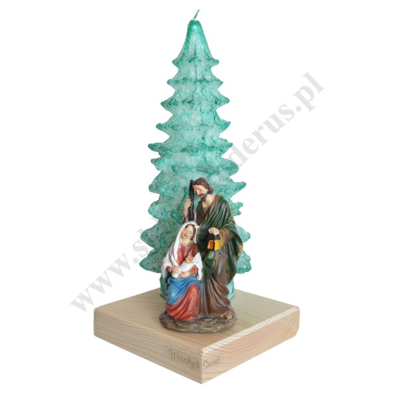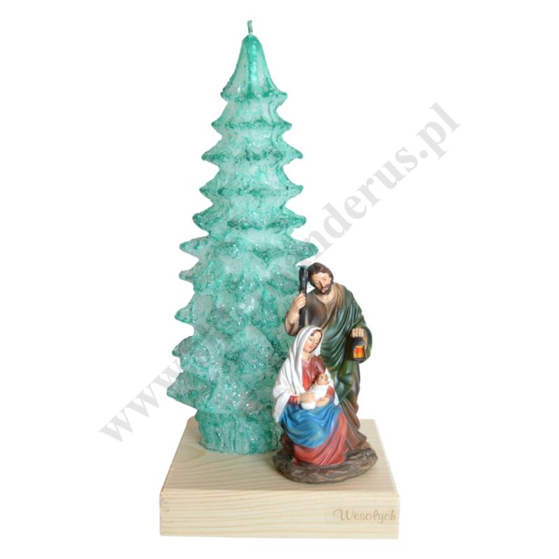Świeca bożonarodzeniowa w kształcie choinki z figurkami Świętej Rodziny. W świecy wbudowany jest dodatkowo światłowód, który w momencie palenia się świecy sam daje naprzemiennie blask w trzech kolorach. Świeca zapakowana jest w celofan z dołączonym siankiem oraz karteczką z bożonarodzeniowymi życzeniami. Wysokość świecy 30 cm, wysokość figurki Świętej Rodziny 13 cm, wymiar podstawy 14 x 14 cm.