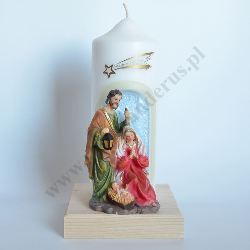 Świeca bożonarodzeniowa zdobiona figurkami przedstawiającymi Świętą Rodzinę. W świecy wbudowany jest dodatkowo światłowód, który w momencie palenia się świecy sam daje naprzemiennie blask w trzech kolorach.