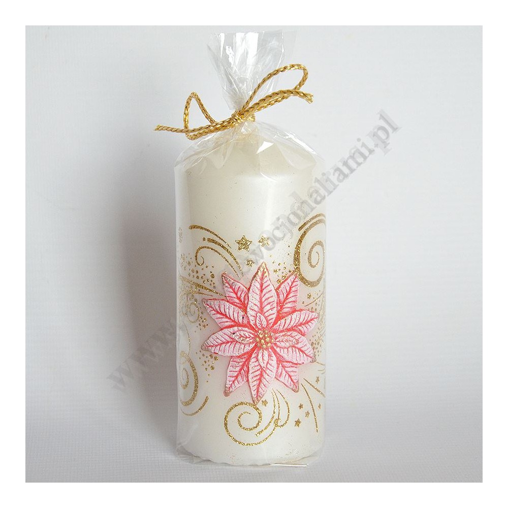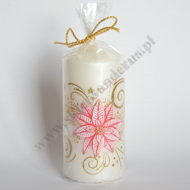 Świeca świąteczna o wysokości 12 cm i średnicy 6 cm, zapakowana w celofan przewiązana ozdobną wstążką.
