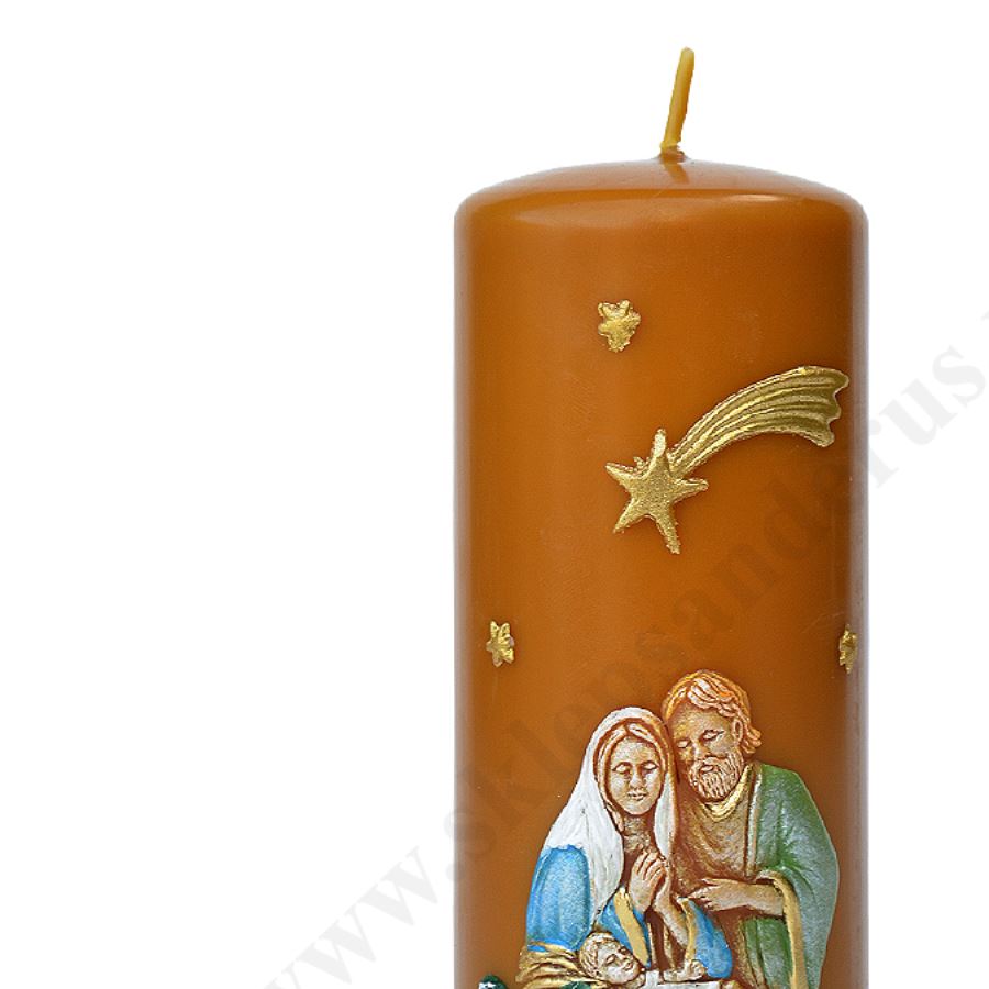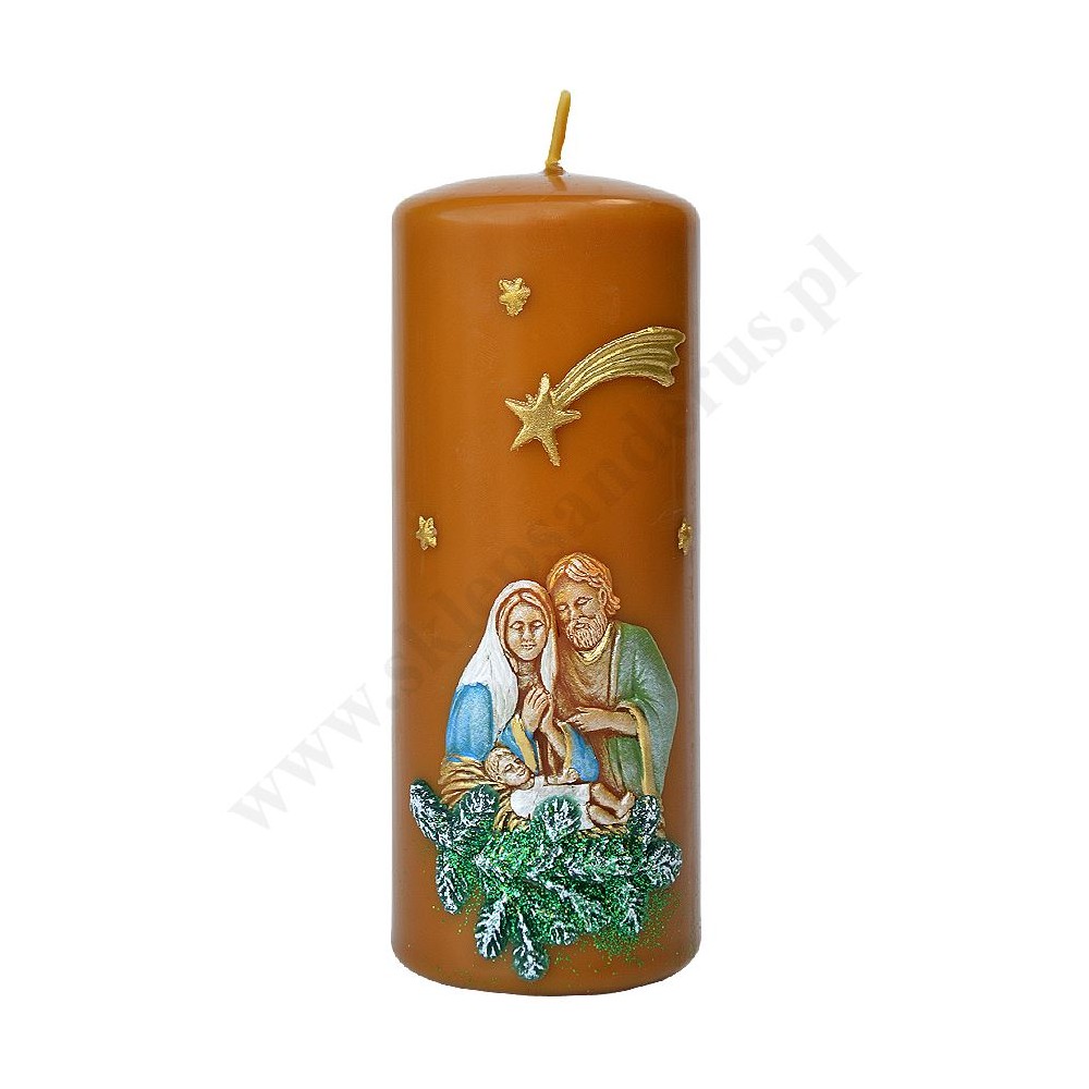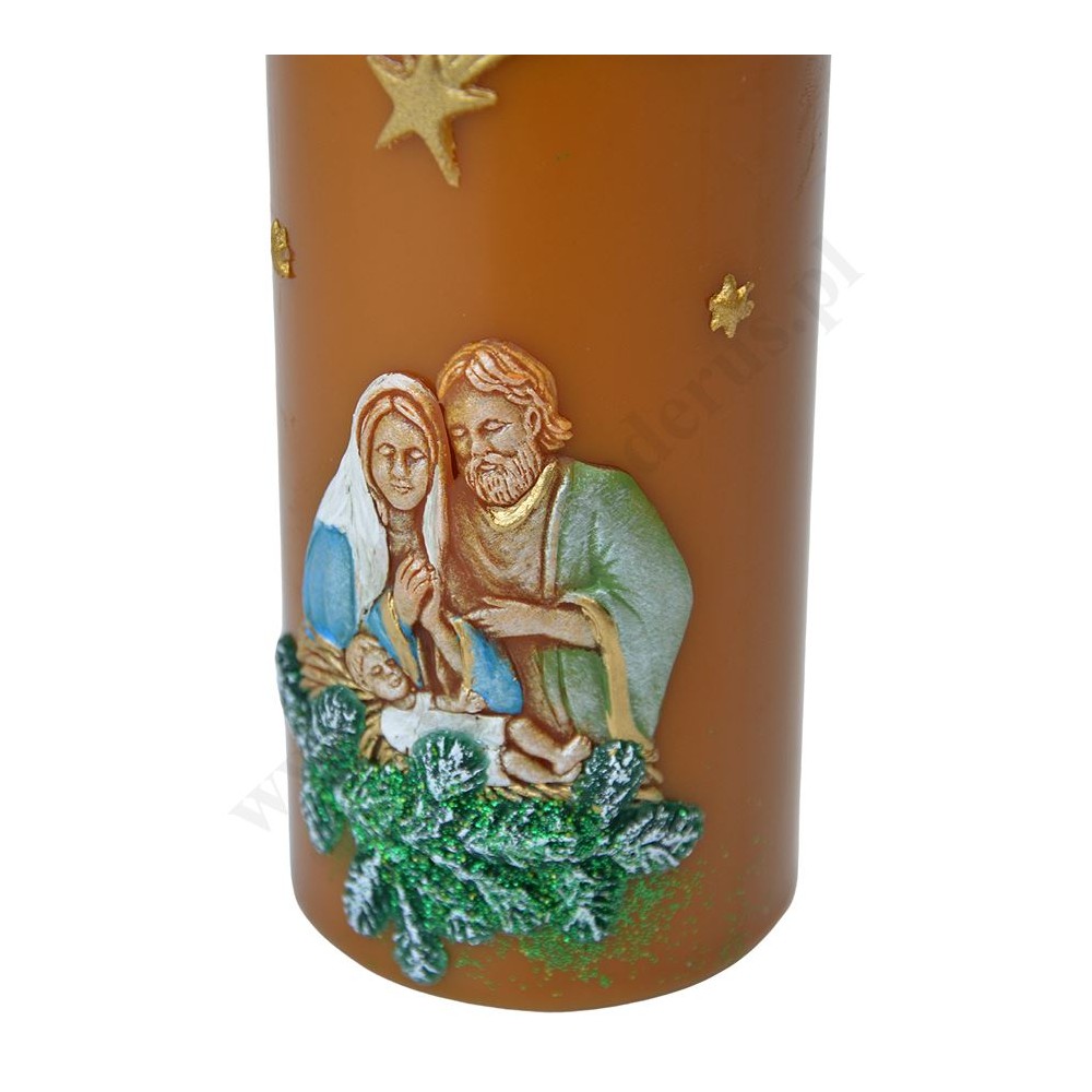 Świeca bożonarodzeniowa parafinowo-woskowa z aplikacją Świętej Rodziny o wysokości 16 cm i średnicy 6.5 cm.