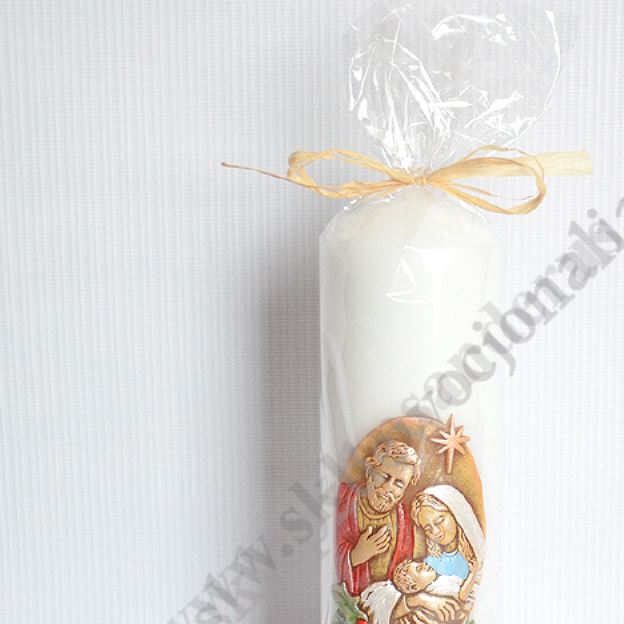 Świeca parafinowa z aplikacją Świętej Rodziny o wysokości 20 cm i średnicy 6 cm.
