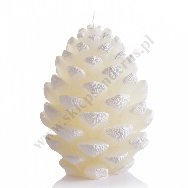 Świeca w kształcie szyszki o wysokości 13 cm i szerokości 10 cm.
