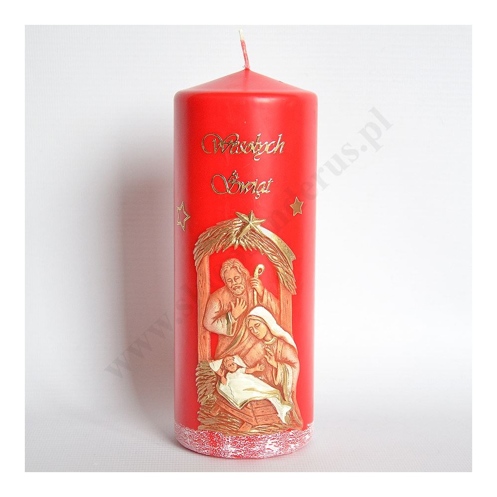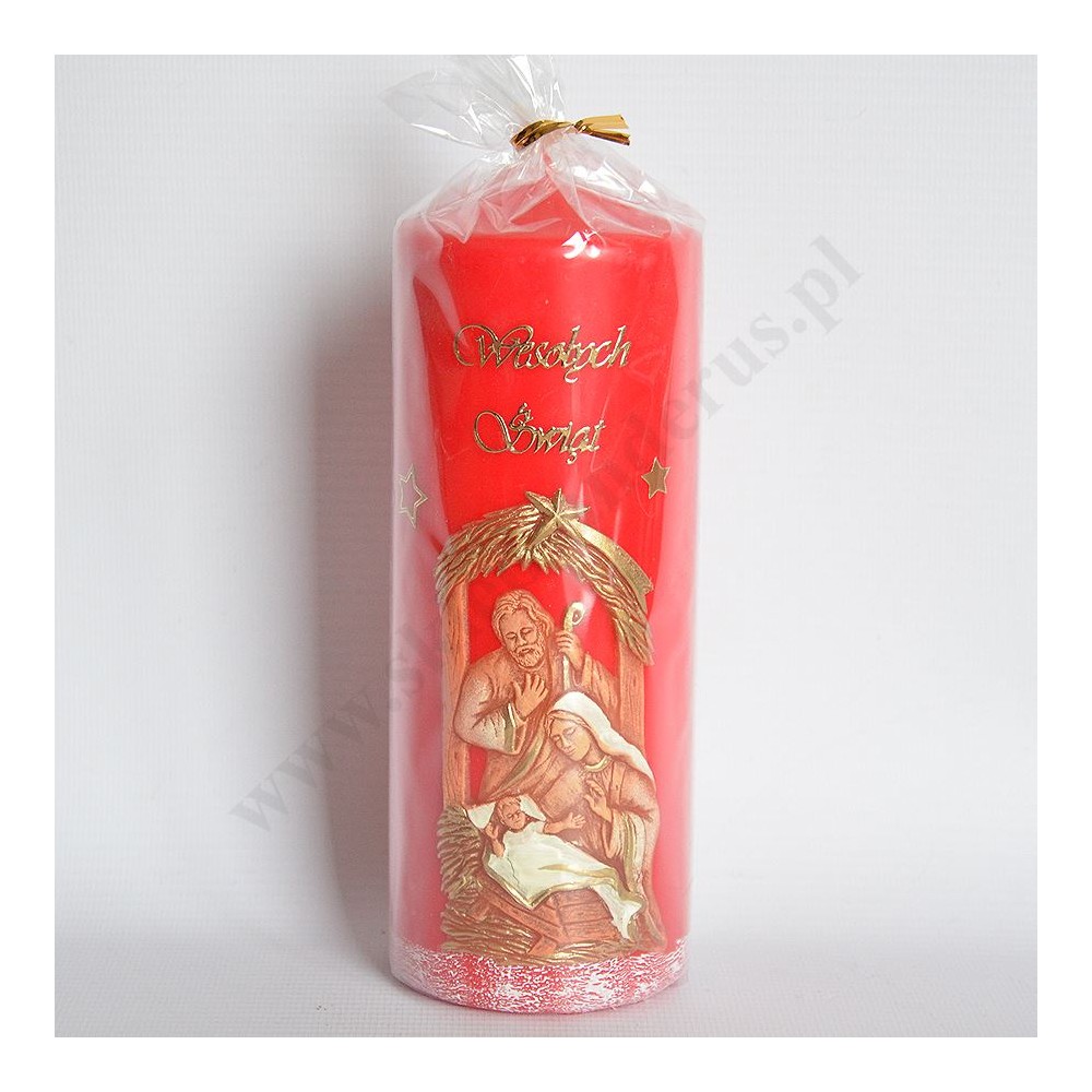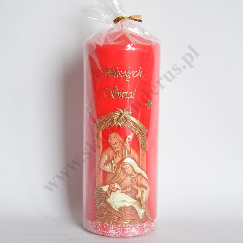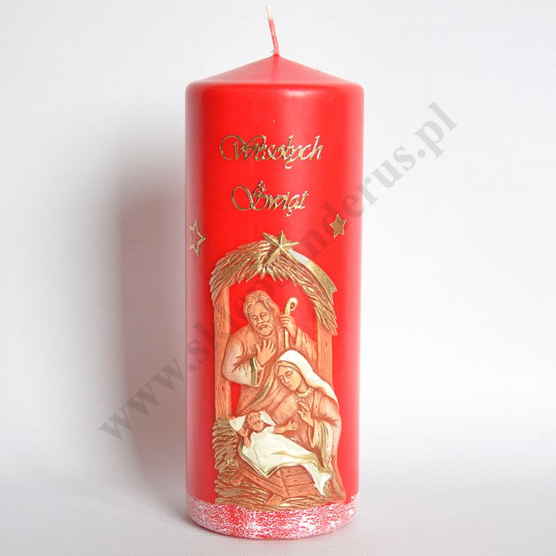 Świeca bożonarodzeniowa z aplikacją Świętej Rodziny. Wysokość świecy 17 cm, średnica świecy 6.8 cm.