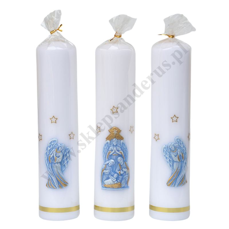 Komplet trzech świec bożonarodzeniowych parafinowych o wysokości 30 cm i średnicy 7 cm. Świece zdobione przestrzennymi aplikacjami Świętej Rodziny i Aniołów.