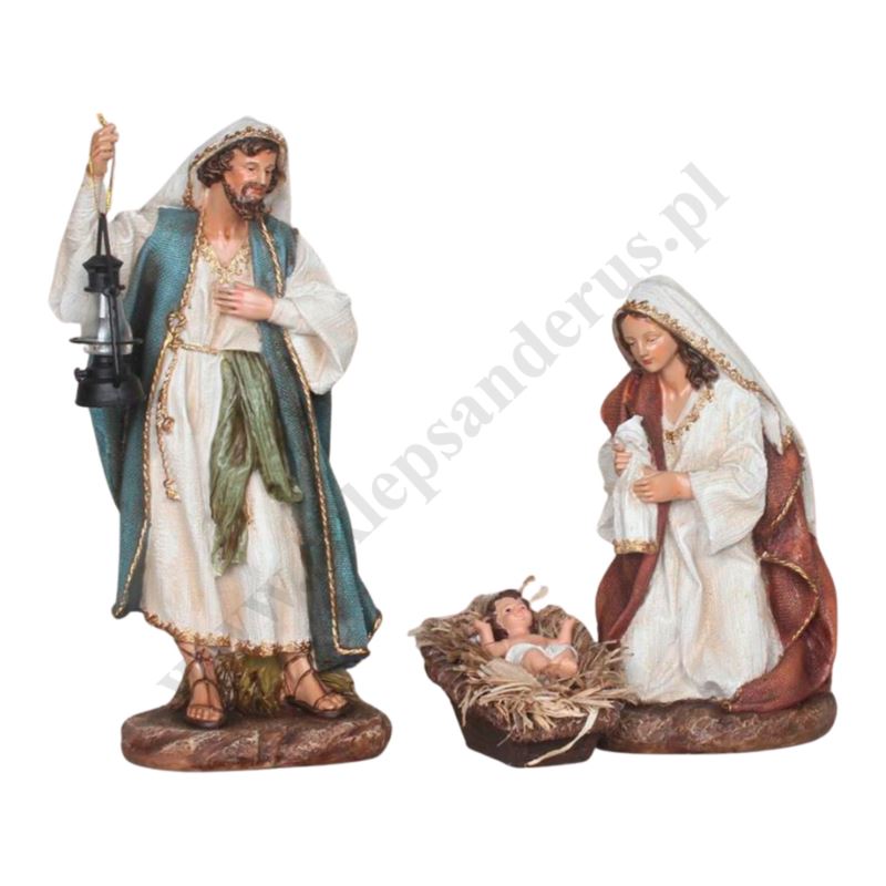 Figury Świętej Rodziny do szopki bożonarodzeniowej o wysokości najwyższej figury 65 cm. Wykonane z masy żywicznej. Szaty o fakturze imitującej płótno. Komplet składa się z trzech elementów: Matki Bożej, Świętego Józefa oraz Dzieciątka w żłóbku.