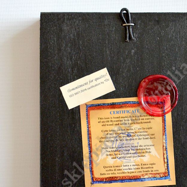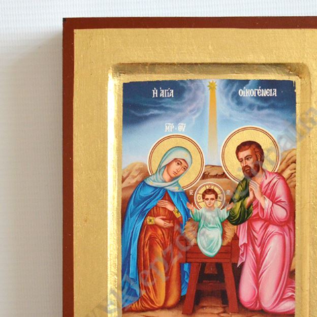 Ikona przedstawiająca Świętą Rodzinę w wymiarze 14 x 18 cm. Ikona ręcznie wykonana na płótnie lnianym wklejonym w drewno. Grubość deski 2.3 cm. Ikona do powieszenia jak i postawienia.