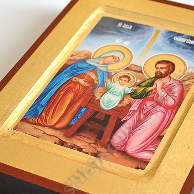 Ikona przedstawiająca Świętą Rodzinę w wymiarze 14 x 18 cm. PONIŻEJ W PRODUKTACH POWIĄZANYCH ISTNIEJE MOŻLIWOŚĆ ZAMÓWIENIA OKAZJONALNEJ DEDYKACJI NA TABLICZCE SREBRNEJ LUB ZŁOTEJ.