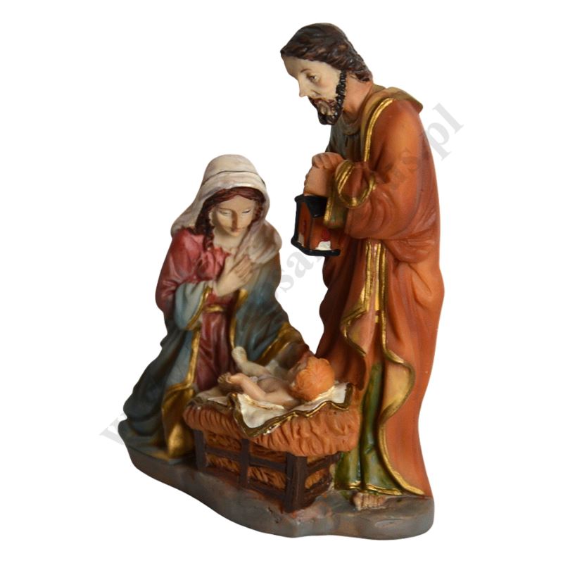 Figurka Świętej Rodziny wykonana z żywicy od tyłu dwa magensy. Wysokość figurki 10 cm, szerokość 7.7 cm, głębokość 3 cm.
