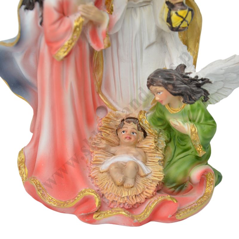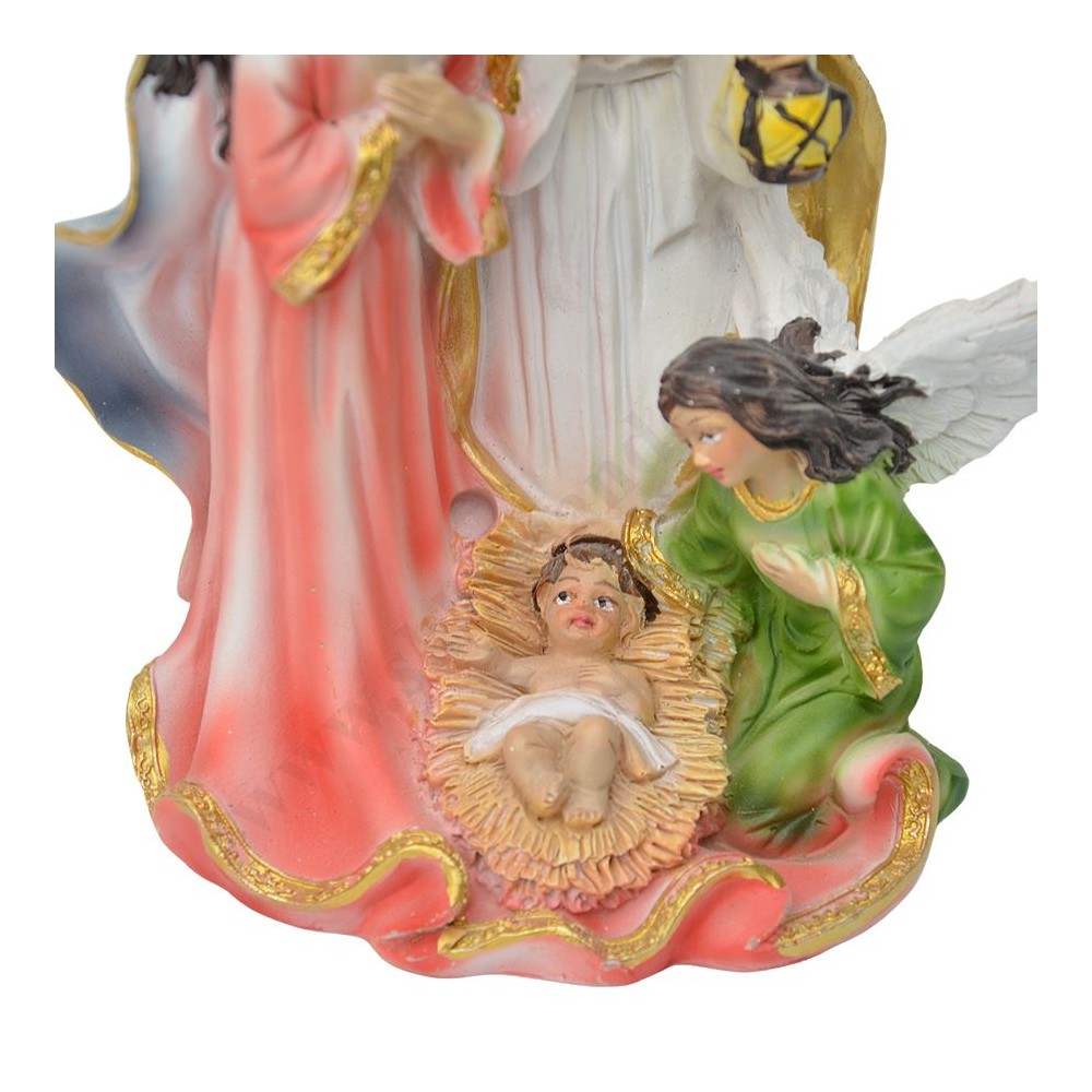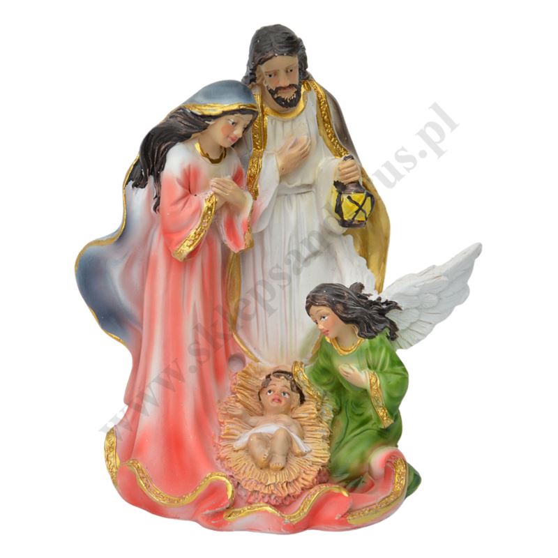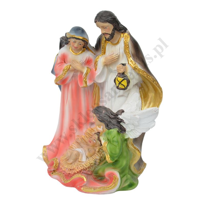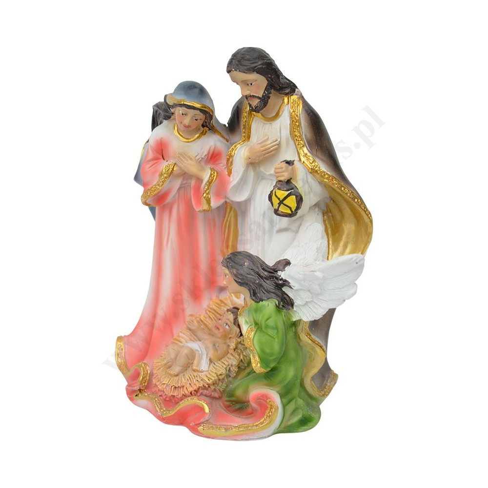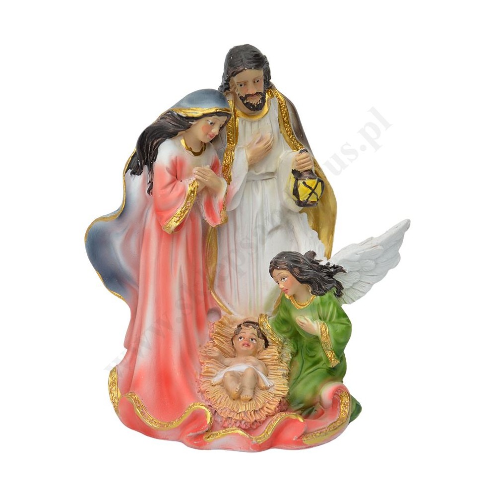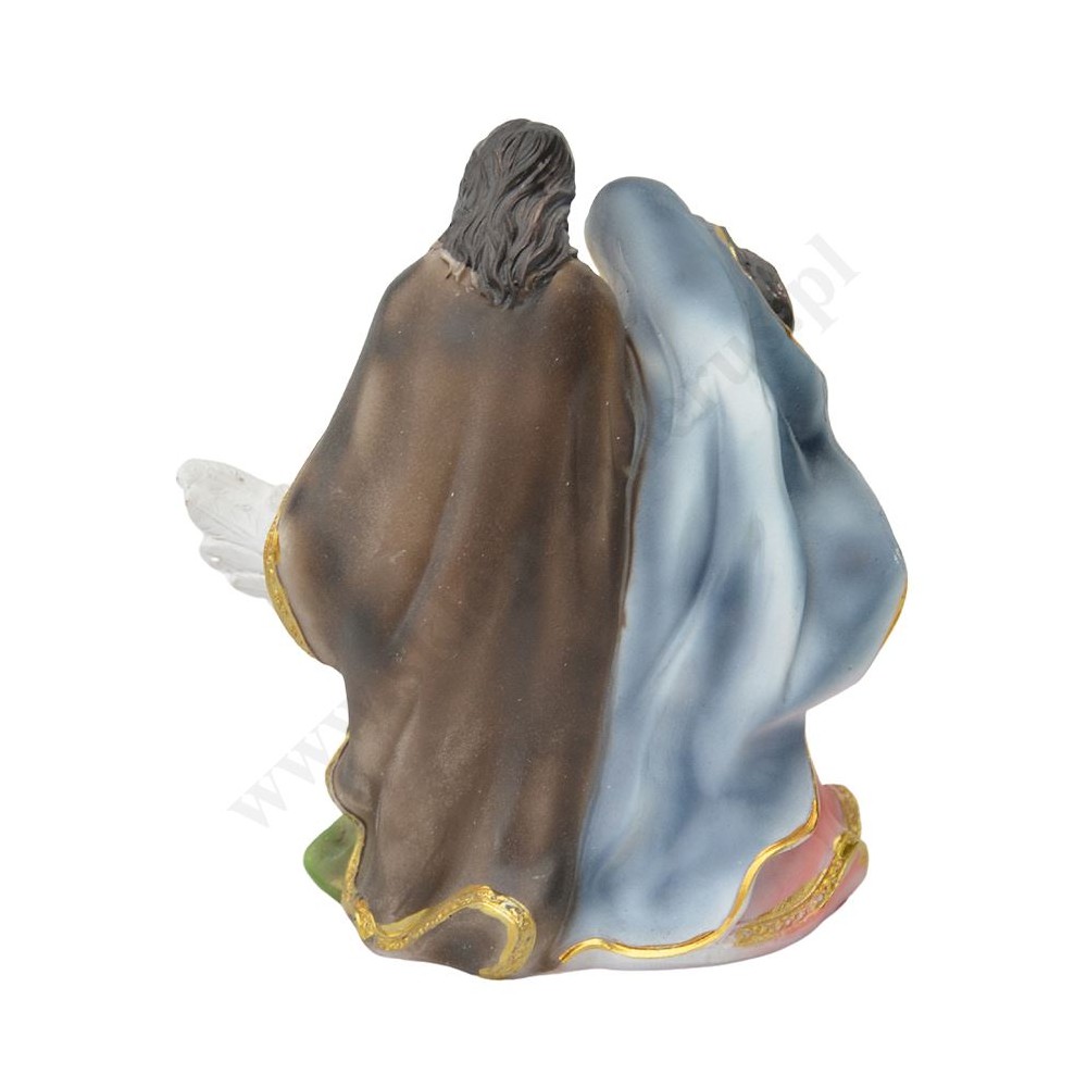 Figurka Świętej Rodziny wykonana z żywicy o wysokości 14 cm, szerokości 12.5 cm i głębokości 8.8 cm