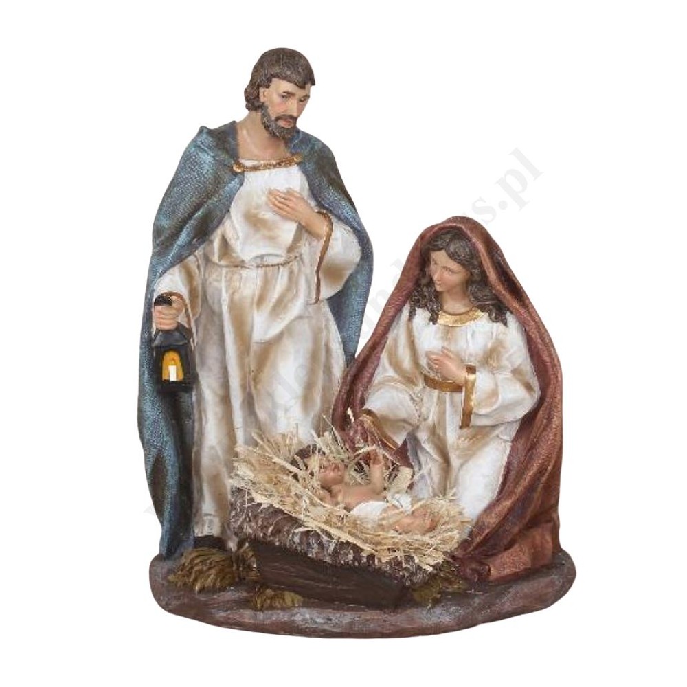 Figura przedstawiająca Świętą Rodzinę w szatach o fakturze imitującej płótno, wykonana z masy żywicznej o wysokości 30 cm.