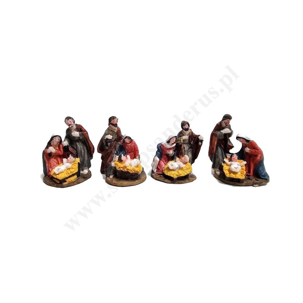 Figurki Świętej rodziny wykonane z polyresinu (mieszanka żywic, mączek alabastrowych i ceramicznych) o wysokości 6.5 cm. Sprzedaż w miksie wzorów.