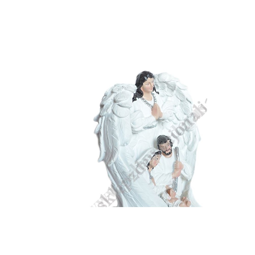 Figurka przedstawiająca Świętą Rodzinę chronioną przez skrzydła anioła. Wysokość figurki 20 cm, szeorkość 16 cm i głębokość 11 cm. Figurka wykonana z masy plastycznej.
