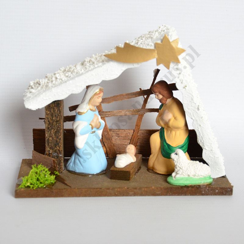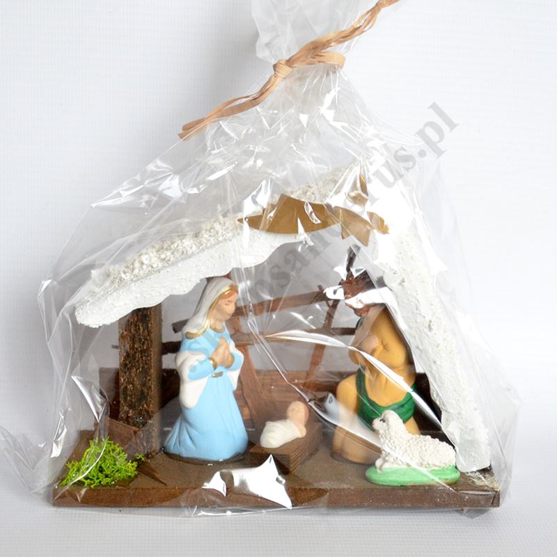 Szopka drewniania z figurkami wykonanymi z masy gipsowej, ręcznie malowane. Wysokość szopki 12 cm, szerokość szopki 16 cm, głębokość szopki 7 cm. Wysokość najwyższej figurki ok. 7 cm.