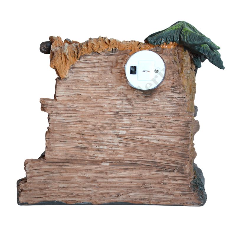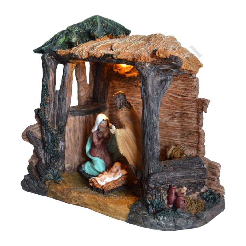 Szopka bożonarodzeniowa, podświetlana wykonana z żywicy o wysokości 16.5 cm, szerokości 18.2 cm i głębokości 9 cm. Baterie w zestawie.