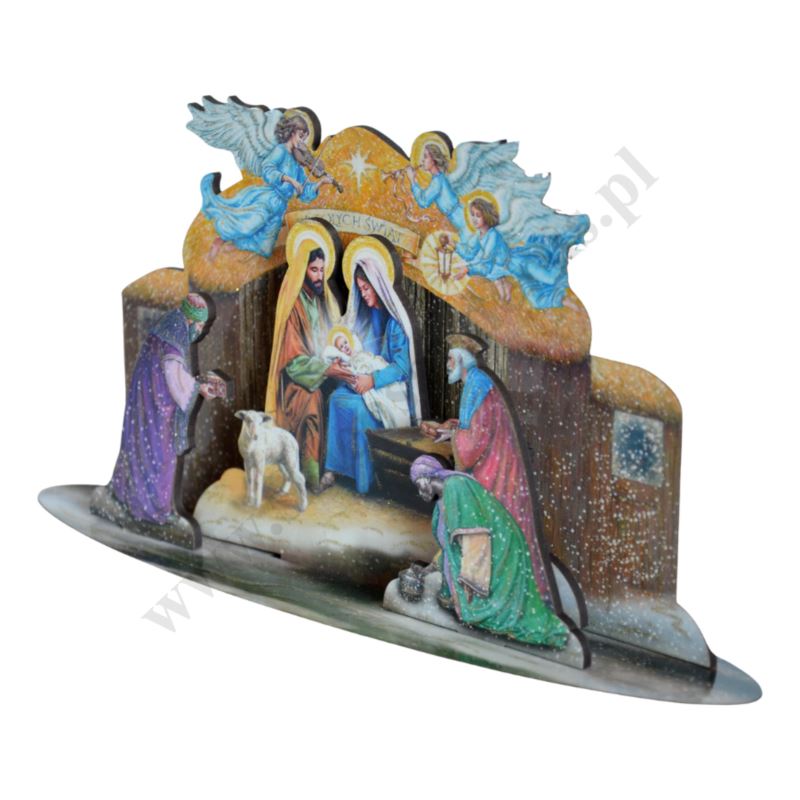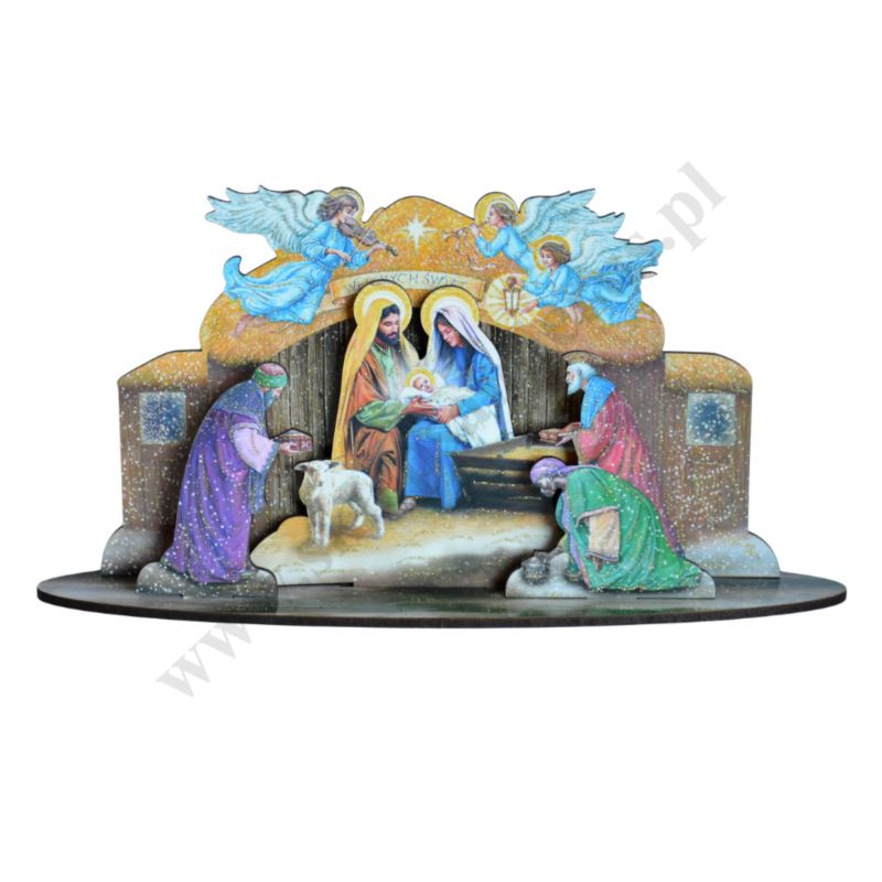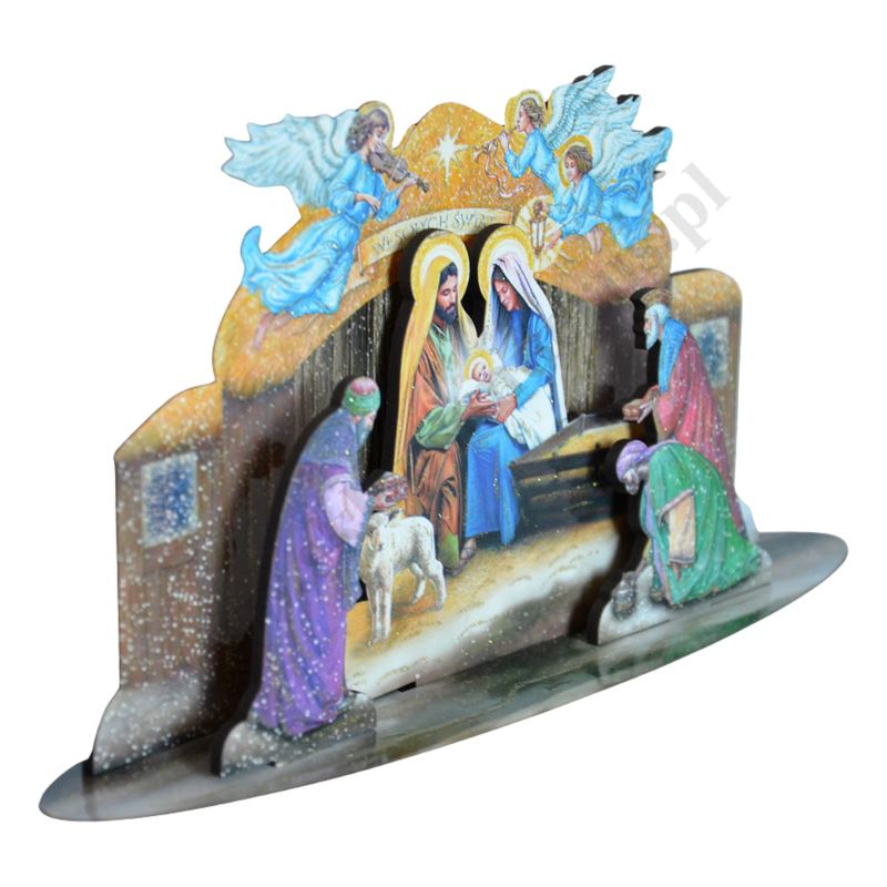 Szopka przestrzenna wykonana na drewnopodobnej płycie HPV, wycinana laserem, kolorowa, ozdabiane złotym brokatem. Rozmiar szopki 21 x 10.5 cm. Zapakowana w cylafonowy woreczek.
