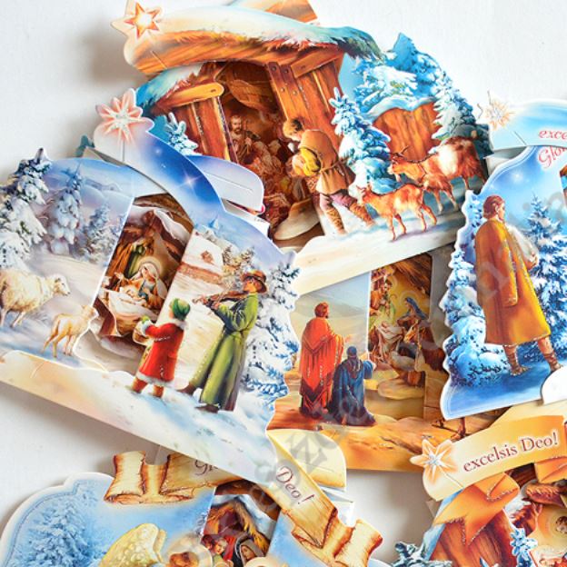 Szopka kartonowa do składania mała, sprzedaż w miksie wzorów, trójwymiarowa, uszlachetnienia: brokat, lakier UV.