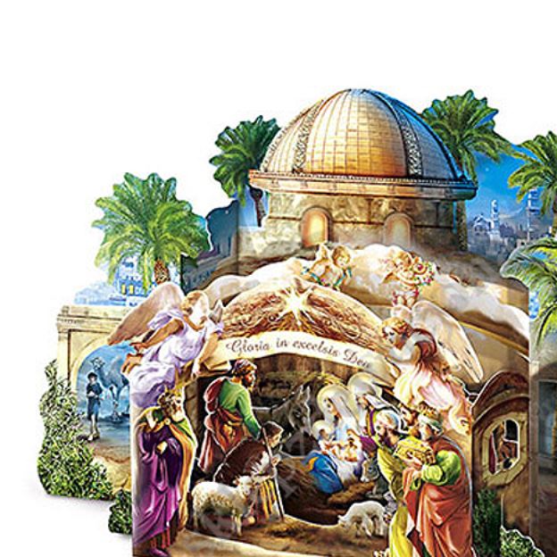 Kartonowa szopka do składania w kopercie z tekstem życzeń na rewersie. Wysokość szopki 18 cm, szerokość szopki 31 cm.