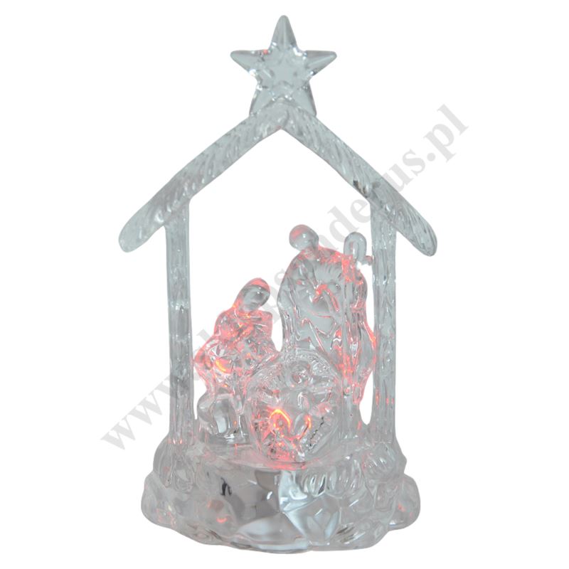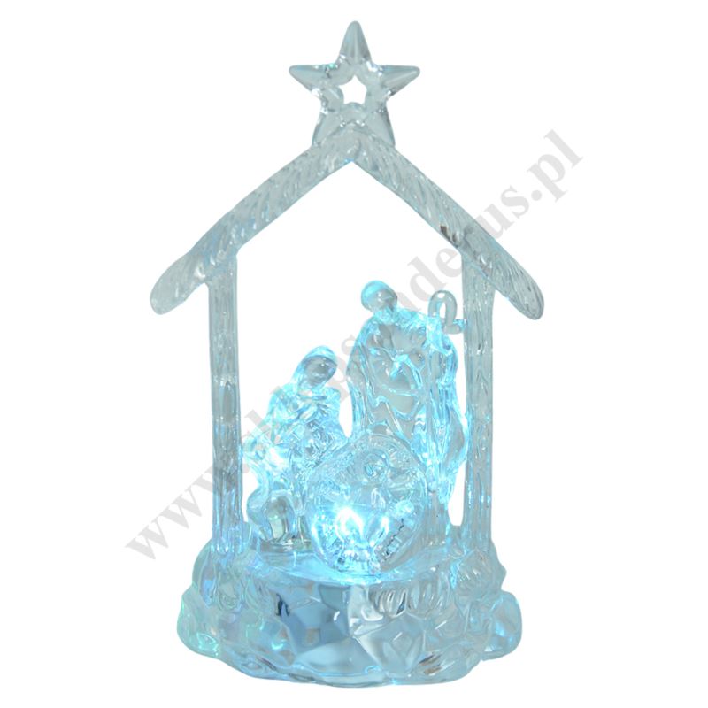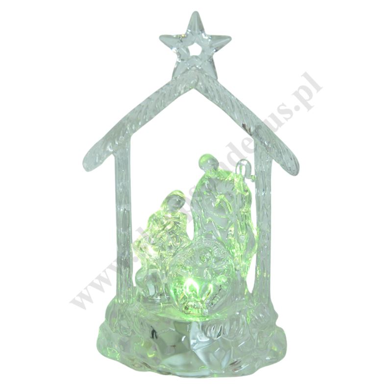 Szopka podświetlana zmieniającym się światłem wykonana z tworzywa sztucznego o wysokości 13 cm i szerokości 8 cm. Baterie w zestawie.