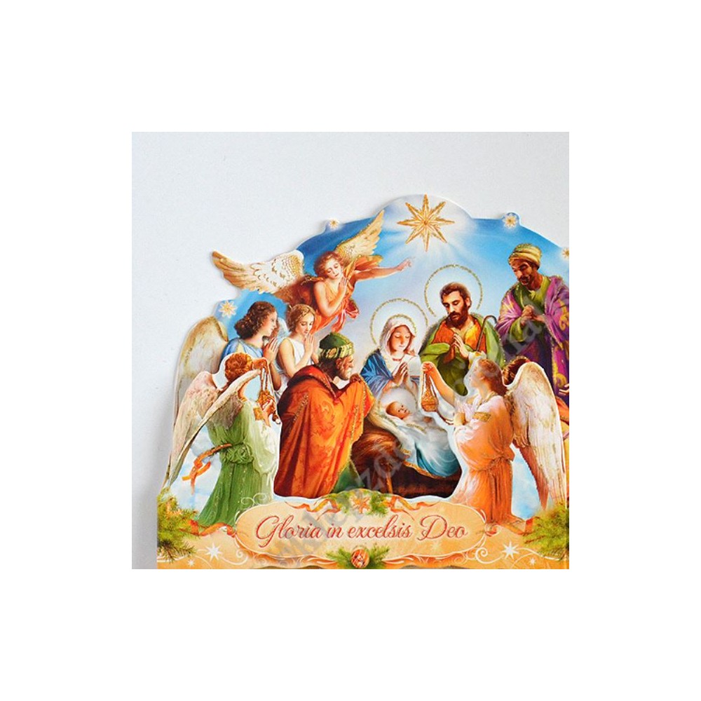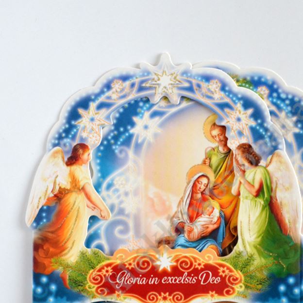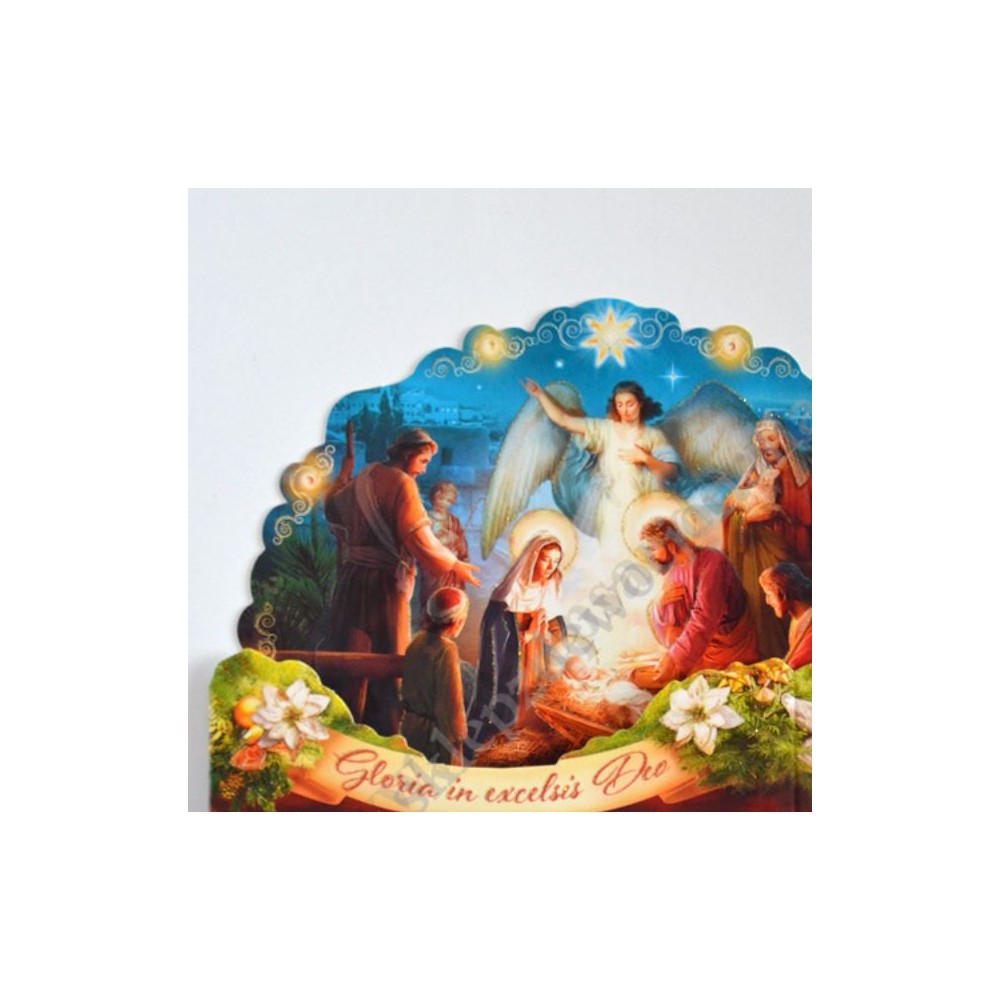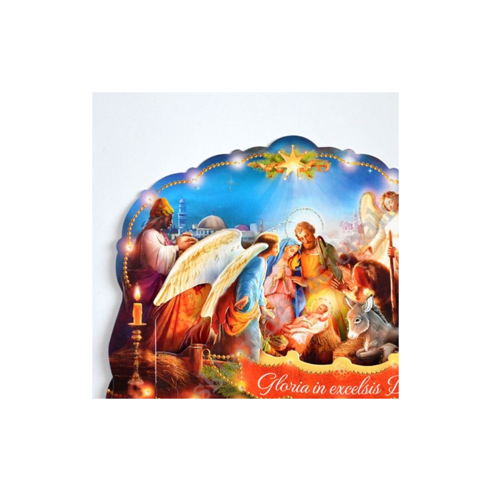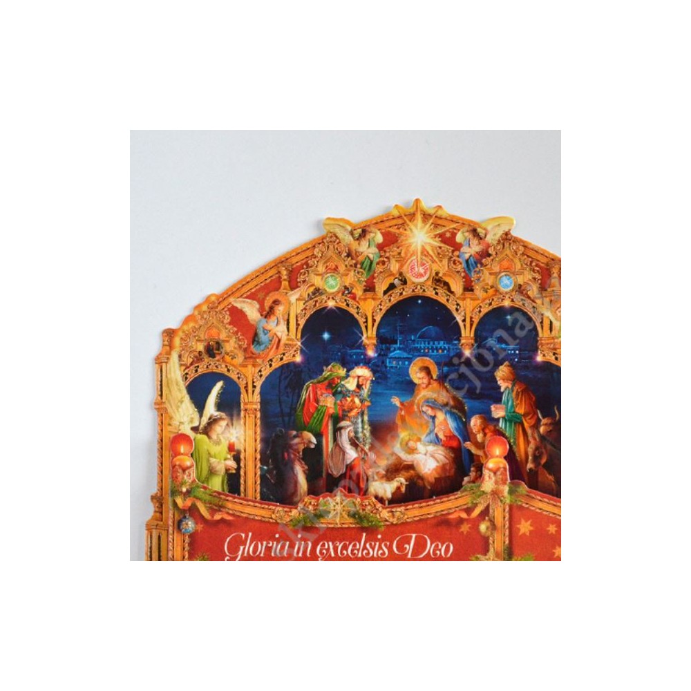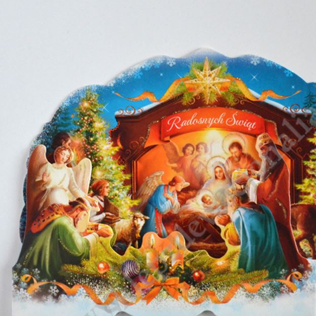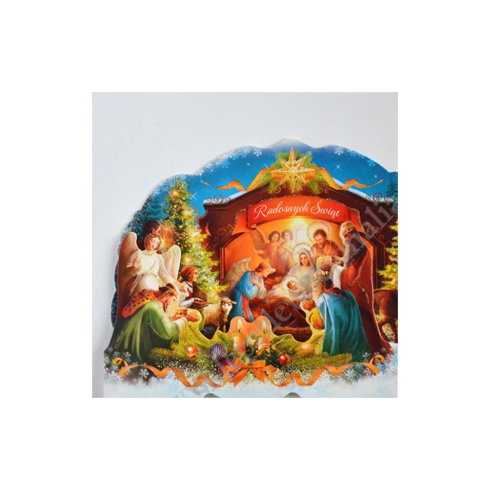 Szopka trójwymiarowa z tekstem życzeń na rewersie, uszlachetniona brokatem, lekierowana, w białej kopercie. Sprzedaż w miksie wzorów.