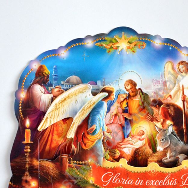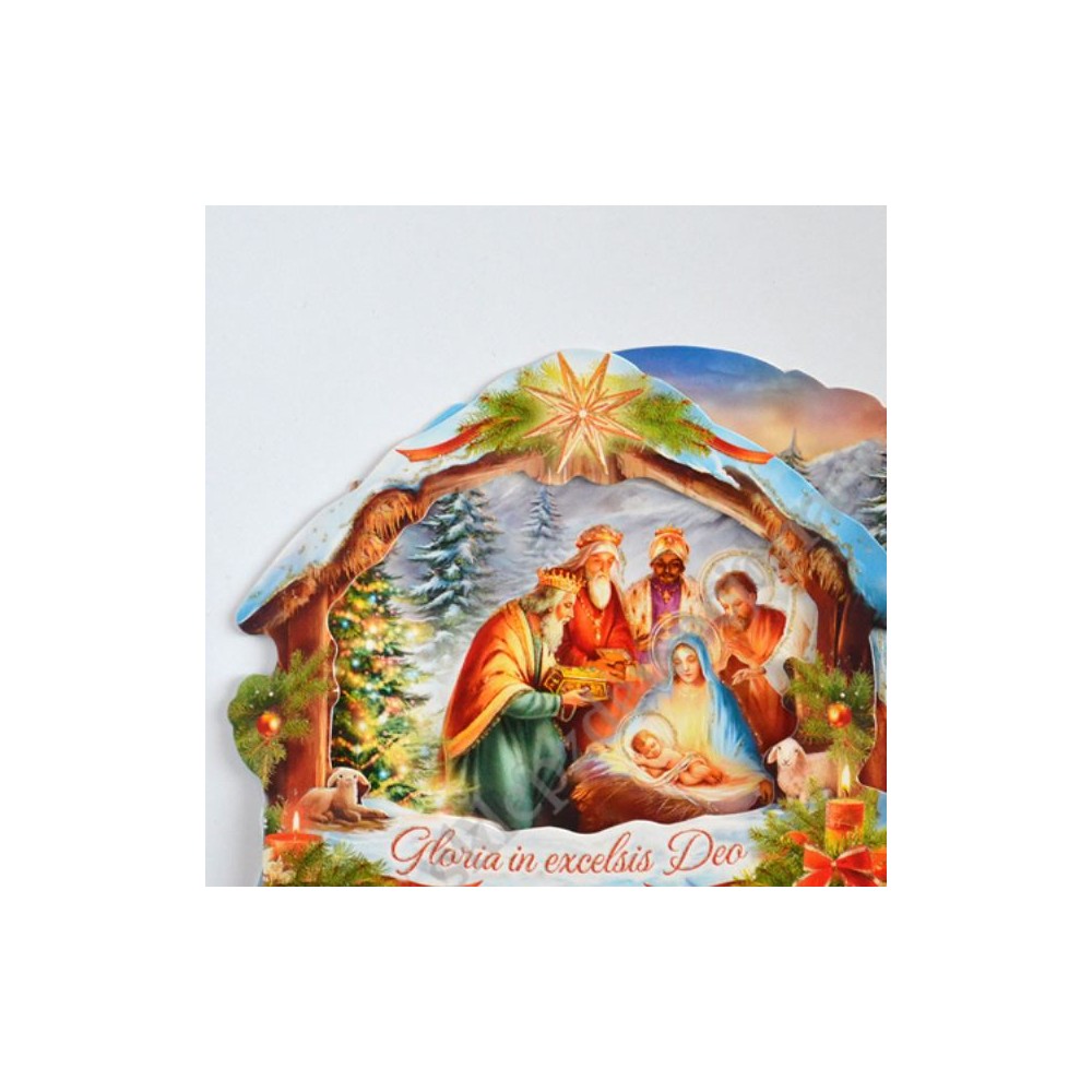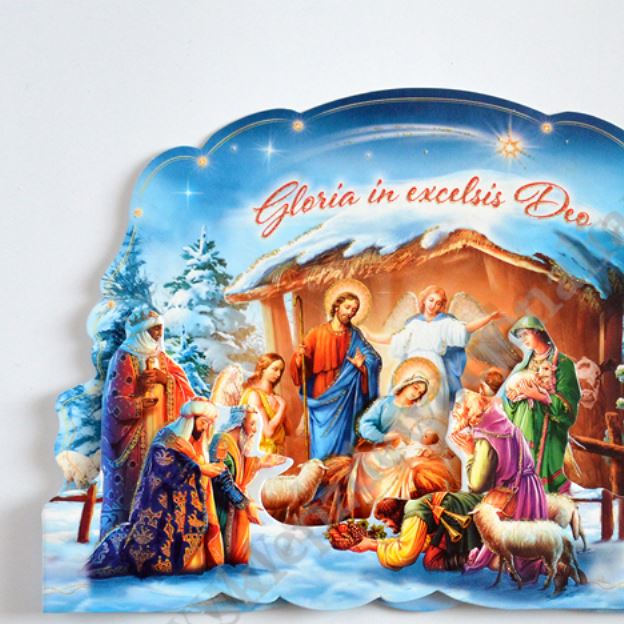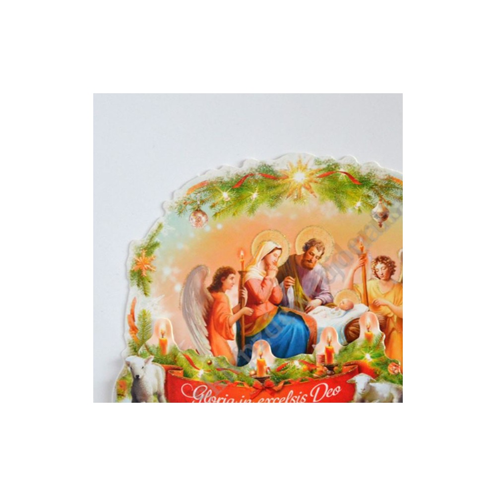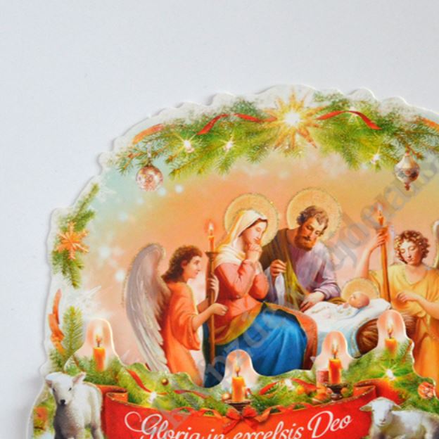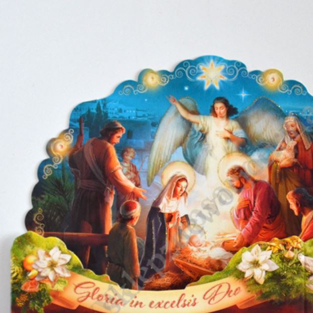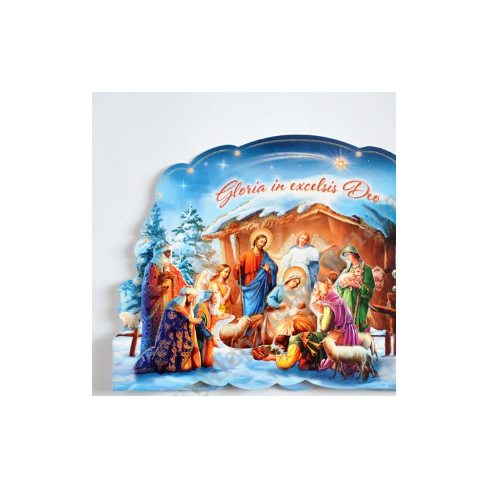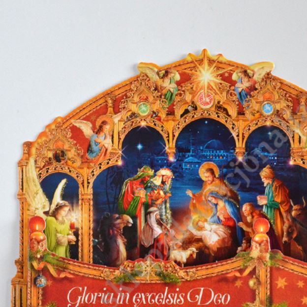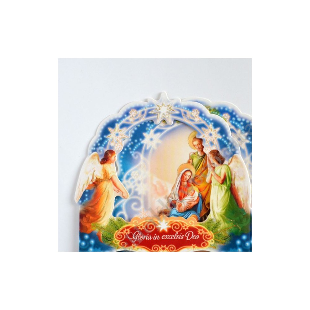 Szopka trójwymiarowa z tekstem życzeń na rewersie, uszlachetniona brokatem, lekierowana, w białej kopercie. Sprzedaż w miksie wzorów.