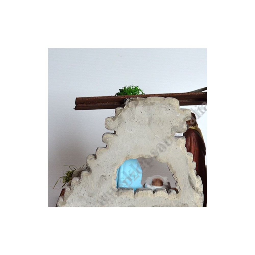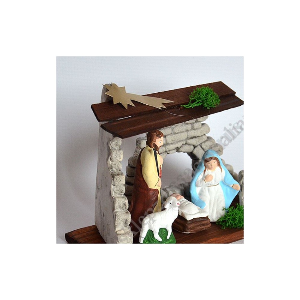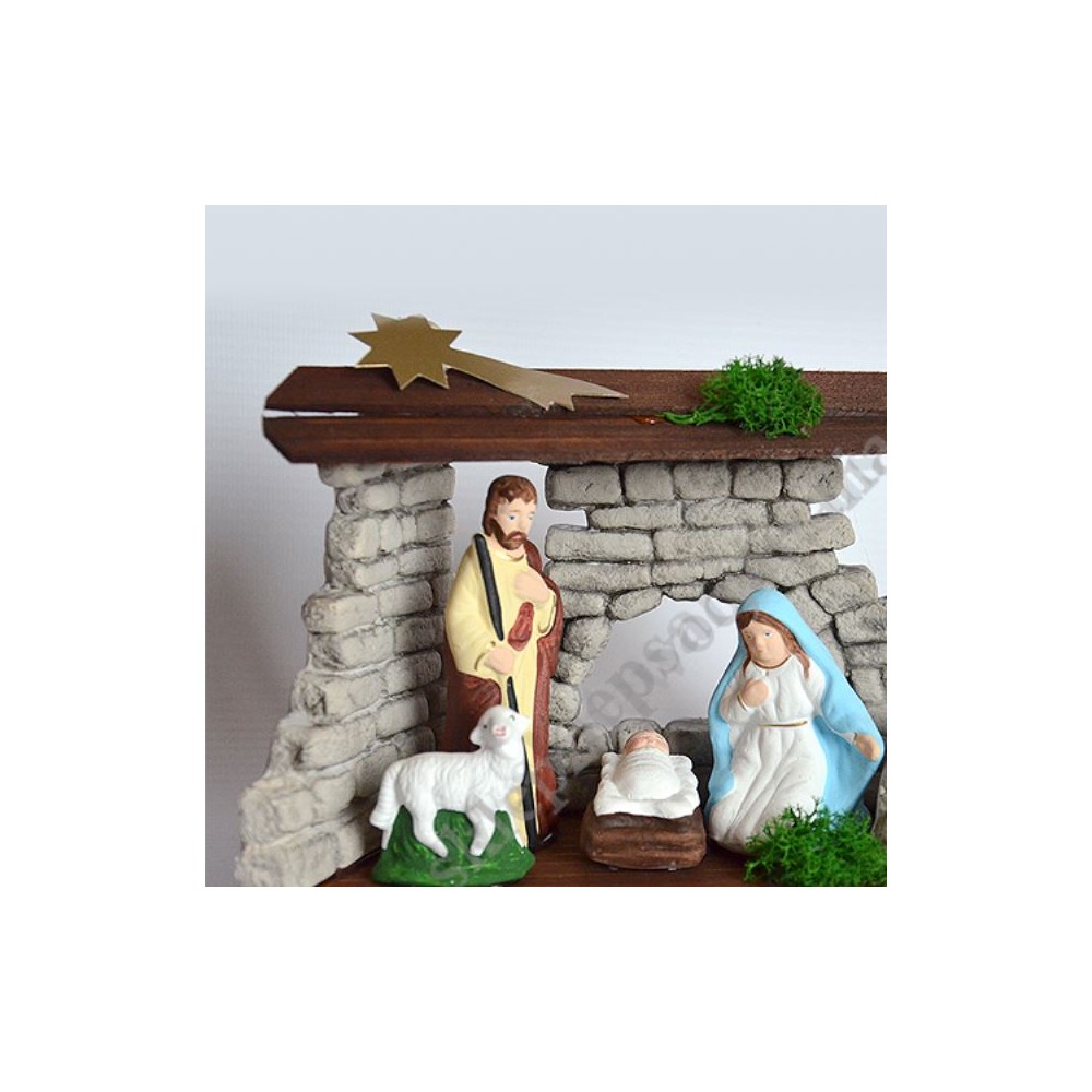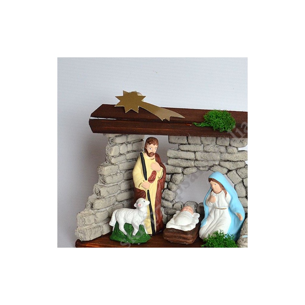 Bożonarodzeniowa szopka o wysokości 12 cm, szerokości 17.5 cm i głębokości 7.5 cm. Wykonana z drewna i gipsu wypalanego, ręcznie malowana.
