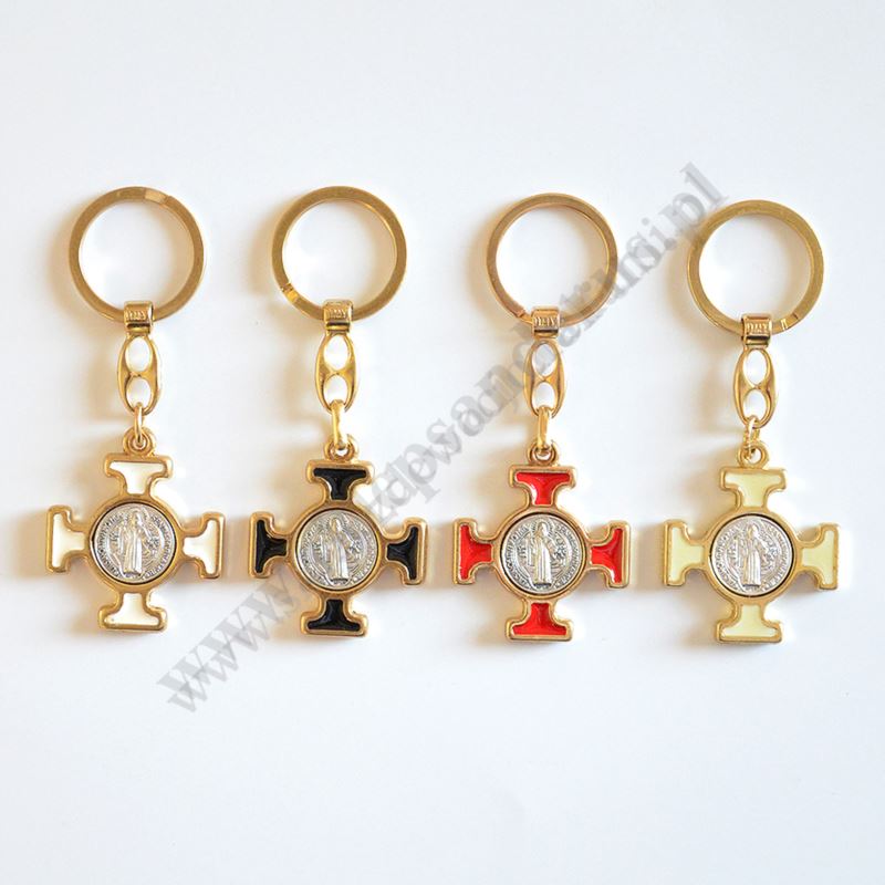 Brelok metalowy z krzyżem Świętego Benedykta w miksie kolorów. Wysokość z koluszkiem 10 cm, szerokość 4 cm.