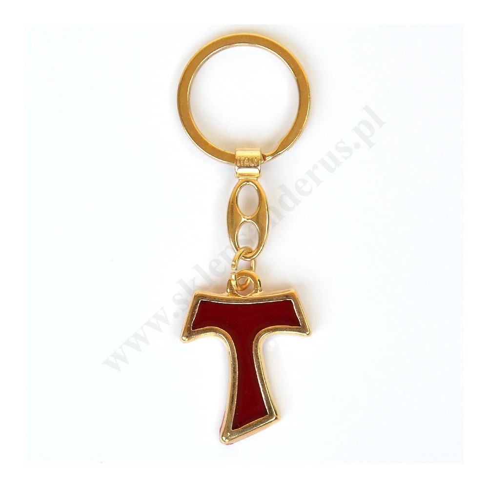 Brelok Tau wykonany z czerwonego szkła witrażowego i metalu. Wysokość 9 cm (z koluszkiem), szerokość 3 cm.