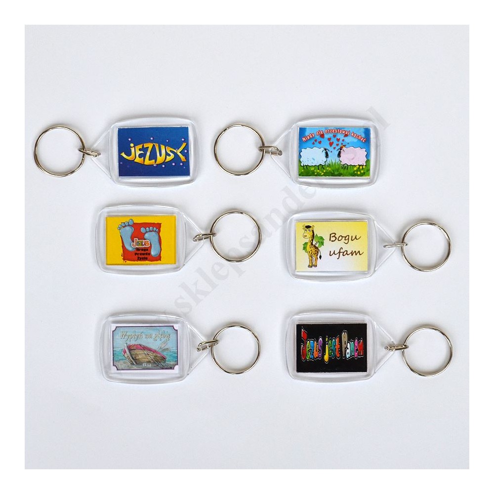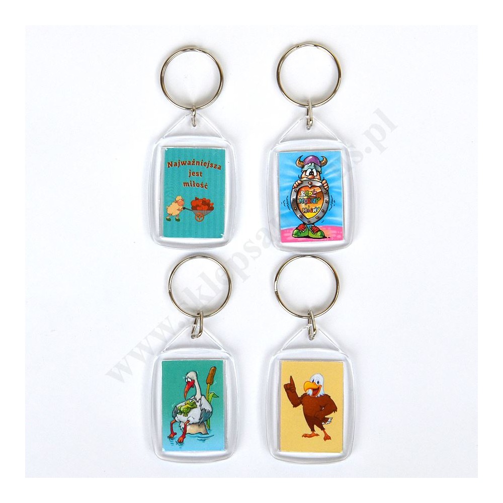 Brelok plastikowy z metalowym koluszkiem, wymiar 3.5 x 5.5 cm. Sprzedaż w miksie wzorów.