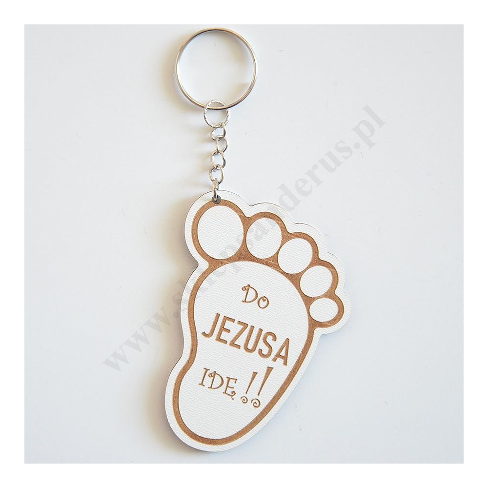 Brelok wykonany ze sklejki z metalowym łańcuszkiem i koluszkiem z napisem Do JEZUSA IDĘ!!. Wysokość breloka (bez koluszka) 7.5 cm, szerokość 5.7 cm.