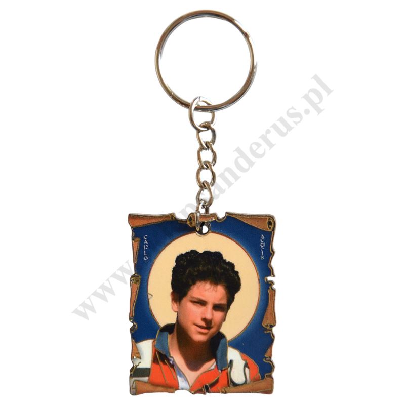 Brelok Świętego Carlo Acutisa wykonany ze sklejki i metalu.