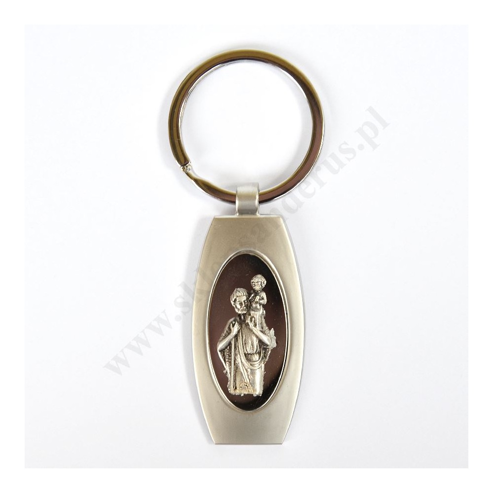 Metalowy brelok Świętego Krzysztofa o długości (z koluszkiem) 9 cm i szerokośći (z kluszkiem) 3.5 cm.