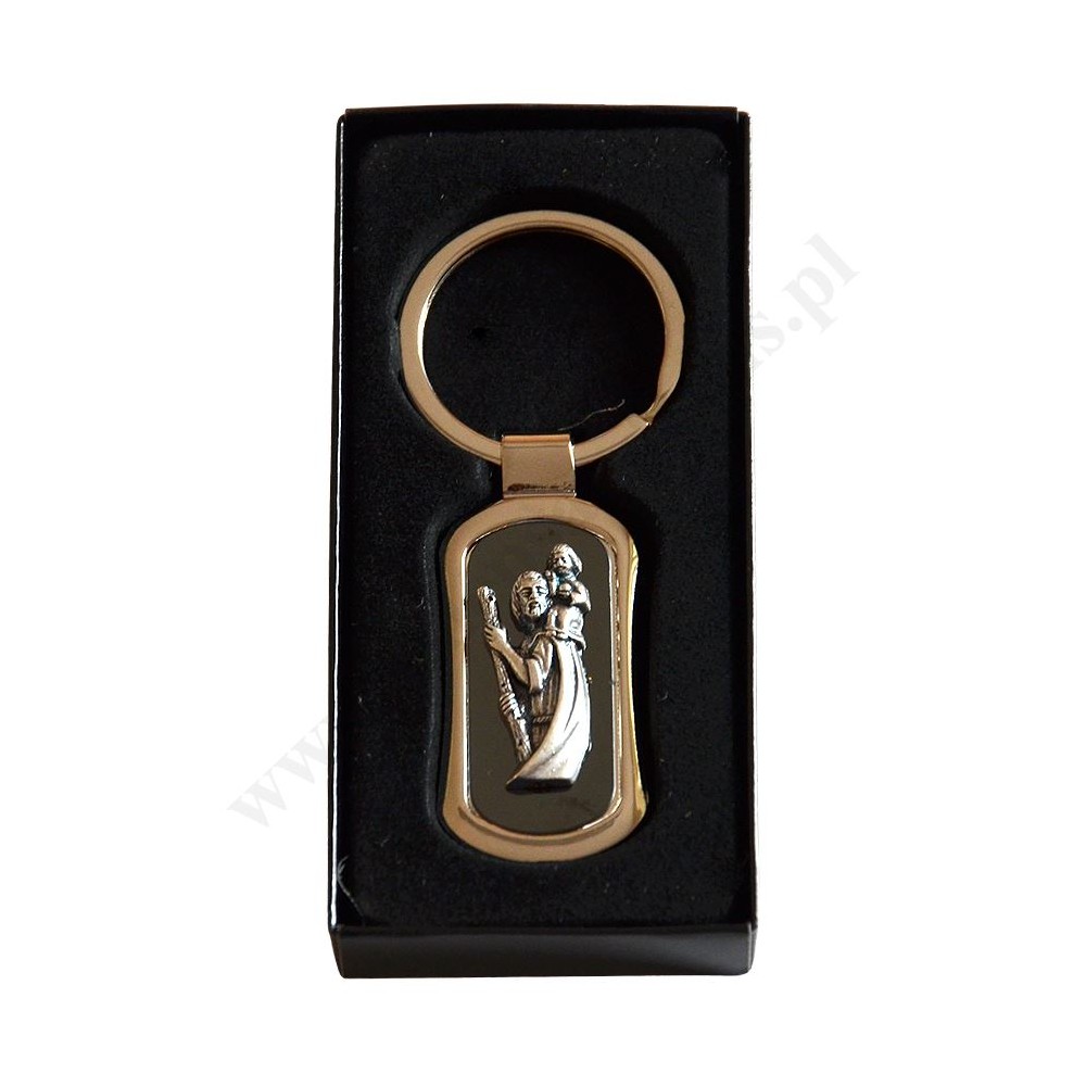Metalowy brelok Świętego Krzysztofa. Wysokość breloka z koluszkiem 8.5 cm, szerokość 2.3 cm. Zapakowany w kartonowe pudełeczko.