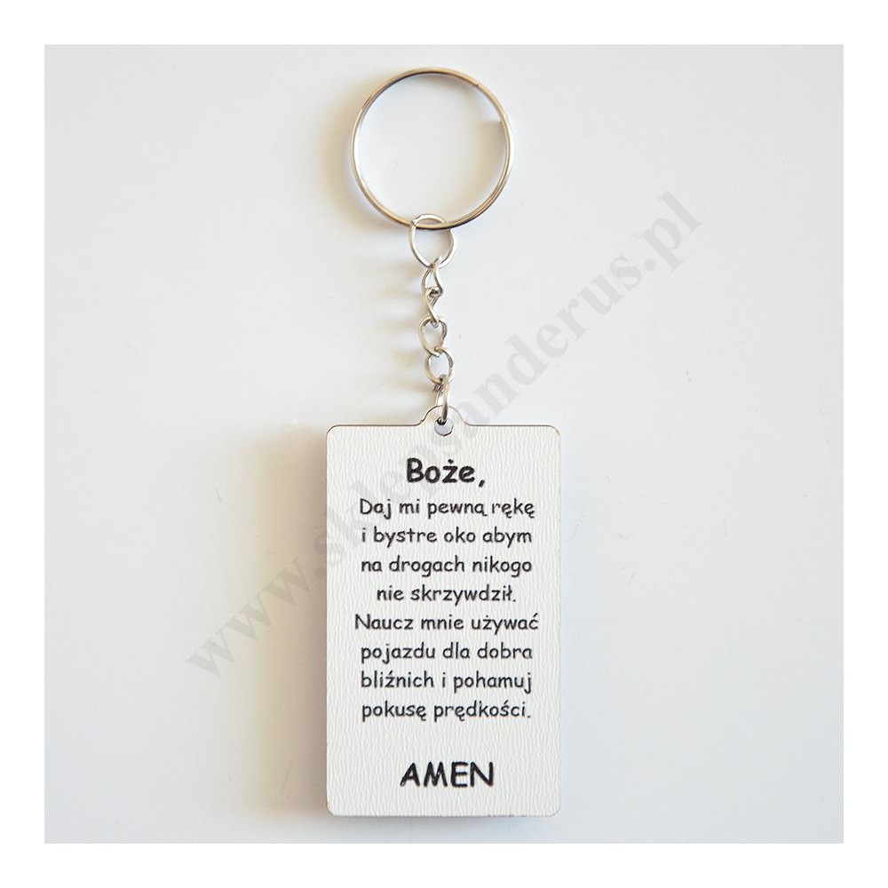 Brelok Świętego Krzystofa wykonany ze sklejki z modlitwą kierowcy na rewersie. Wysokość breloka (bez koluszka) 5.7 cm, szerokość 3.4 cm.