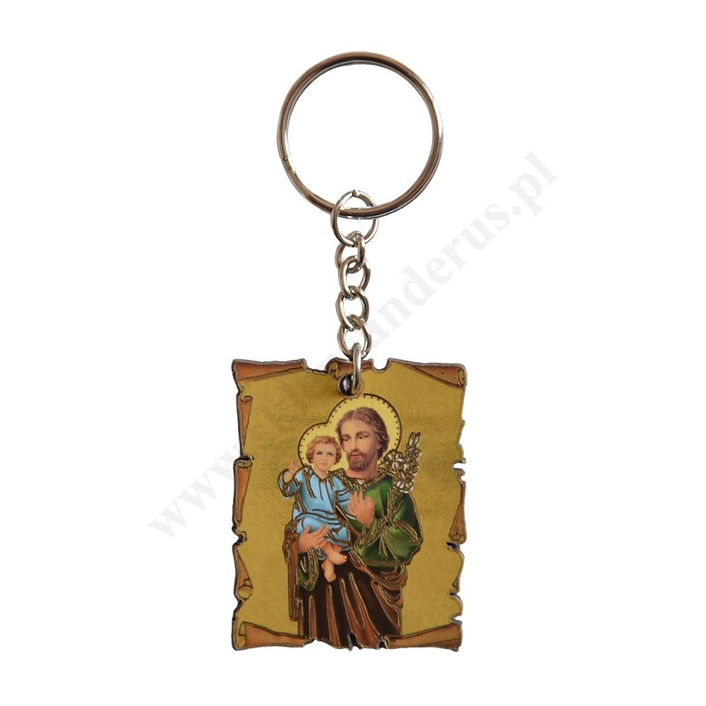 Brelok z wizerunkiem Świętego Józefa na metalowym łańcuszku i koluszku.