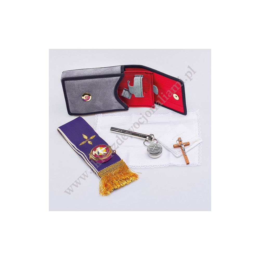 Bursa z wyposażeniem liturgicznym do posługi dla chorych. Wykonane z zamszu, zamykana na magnetyczny zatrzask.