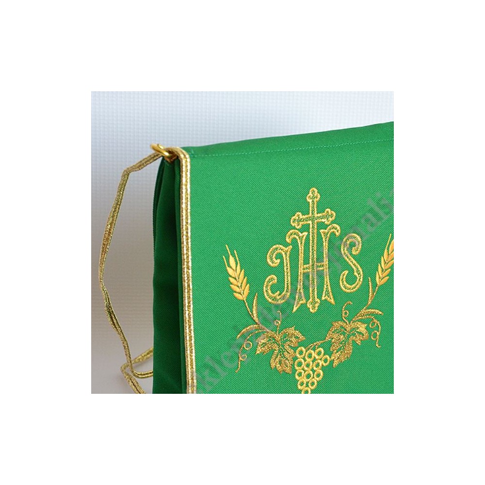 Bursa przeznaczona do wizyty z Komunią świętą u chorych, zdobiona eucharystycznym haftem. Zapinana na rzep.