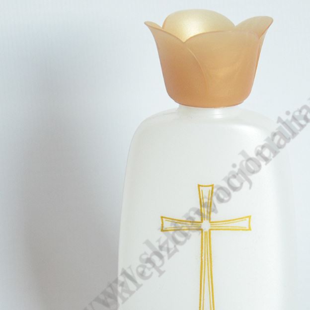 Butelka na wodę święconą z tworzywa sztucznego o wysokości 10.7 cm, szerokości 5 cm. Sprzedaż w miksie wzorów.