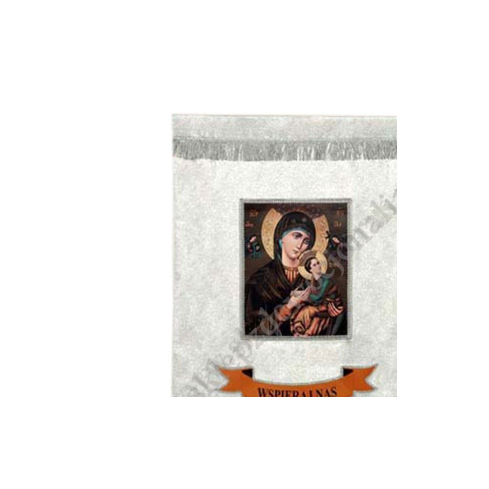 Chorągiew maryjna z wizerunkiem Matki Bożej Nieustającej Pomocy o wymiarach szerokość 85 cm, wysokość 125 cm.