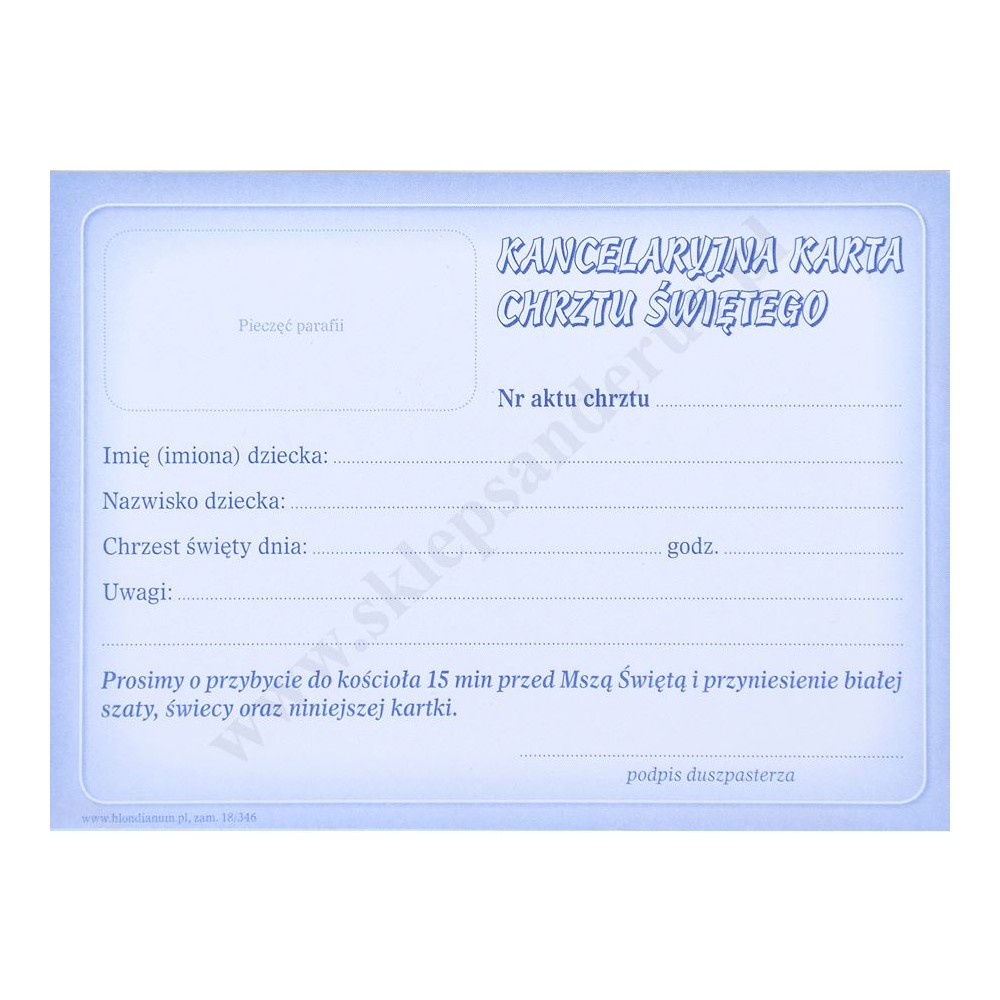 Kancelaryjna karta Chrztu Świętego w formacie 14 x 10 cm, sprzedać w paczkach po 50 szt.