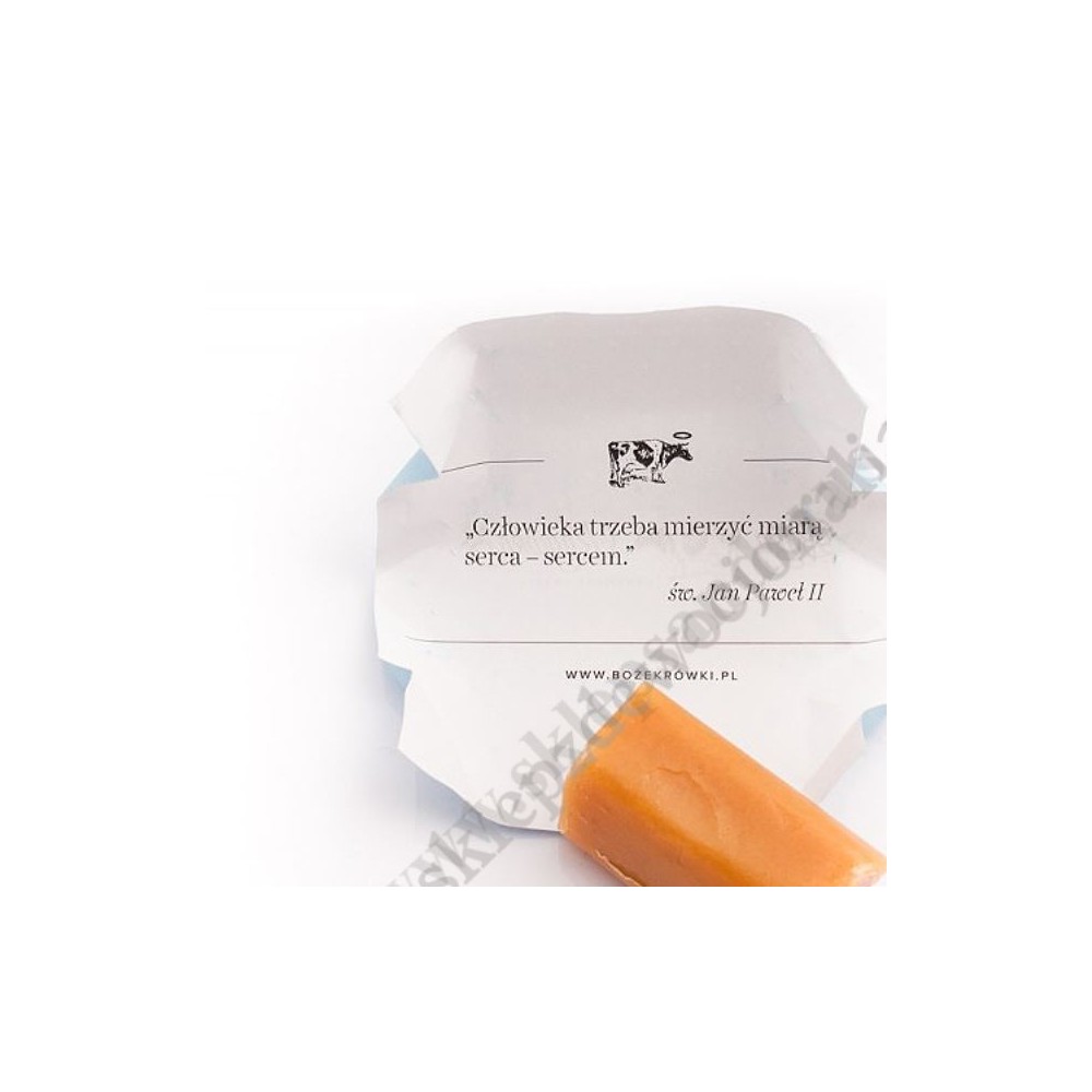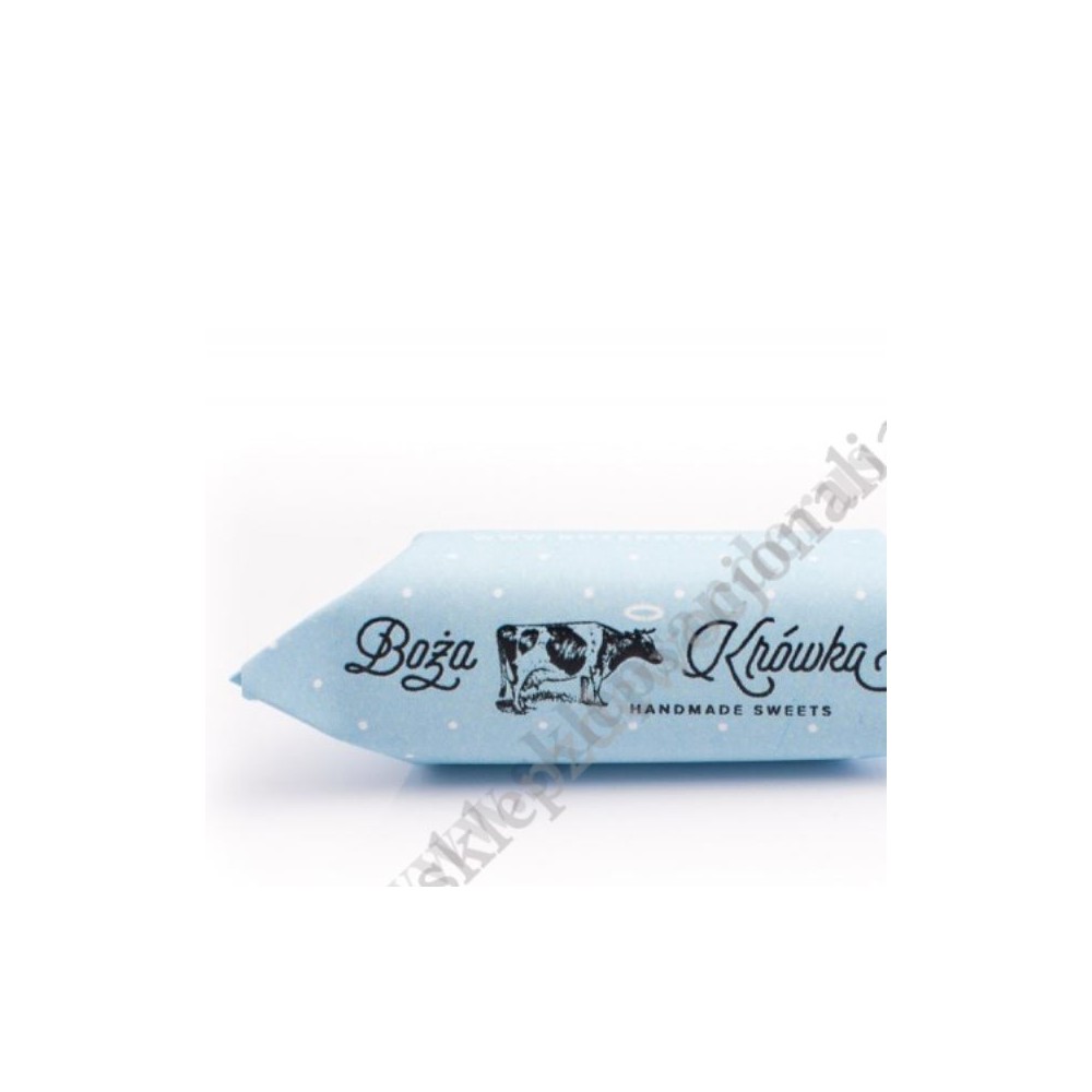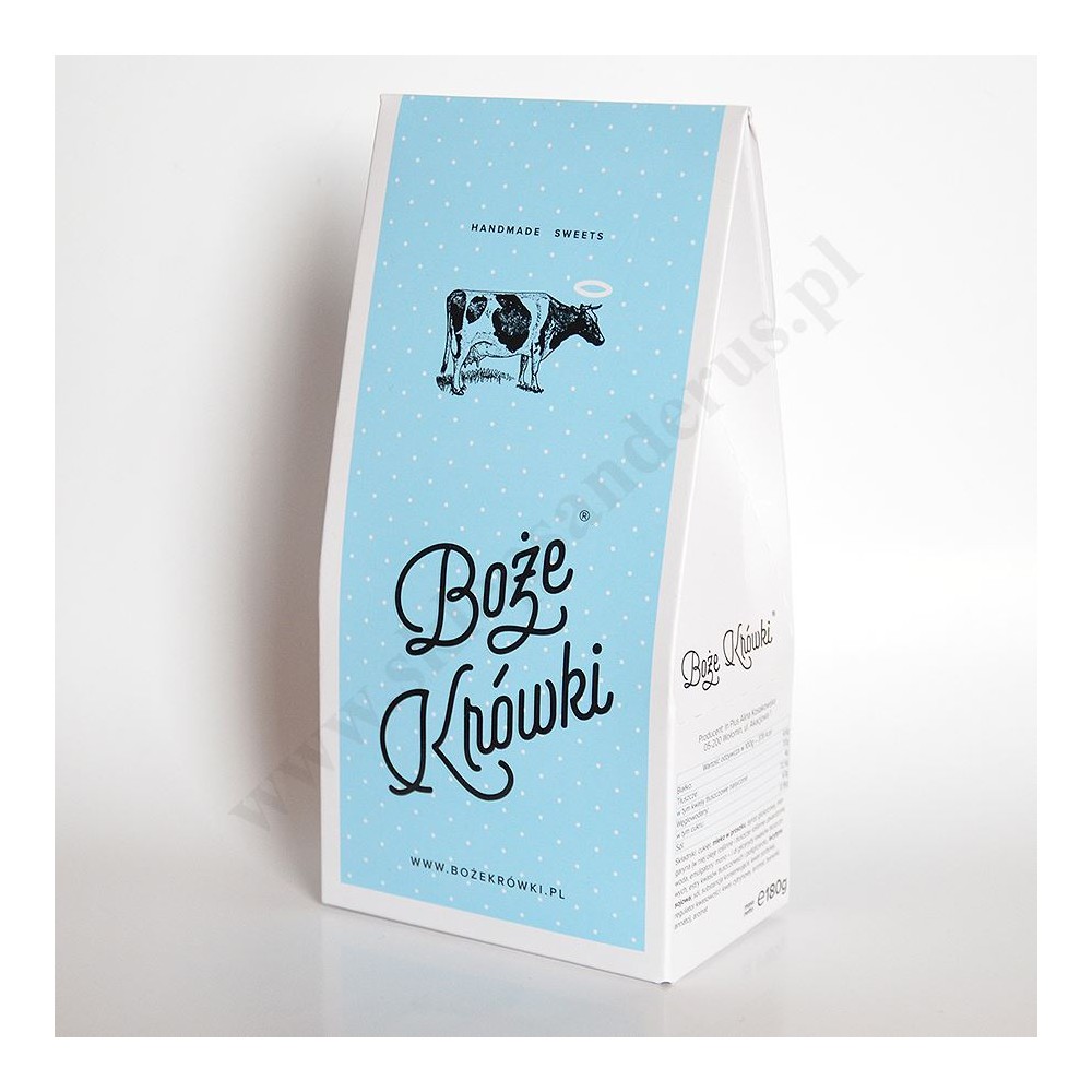 Boże Krówki zapakowane w elegancką papierową torebkę zamkniętą naklejką, na której są umieszczone niezbędne informacje o produkcie.