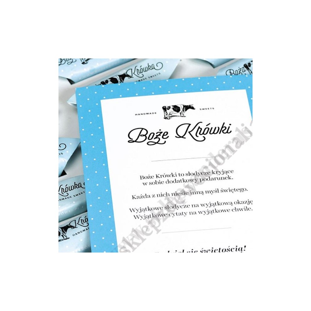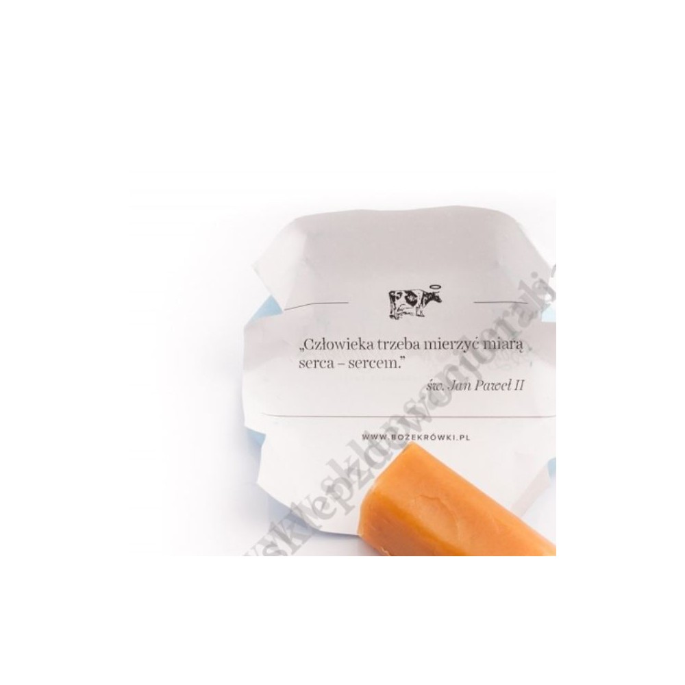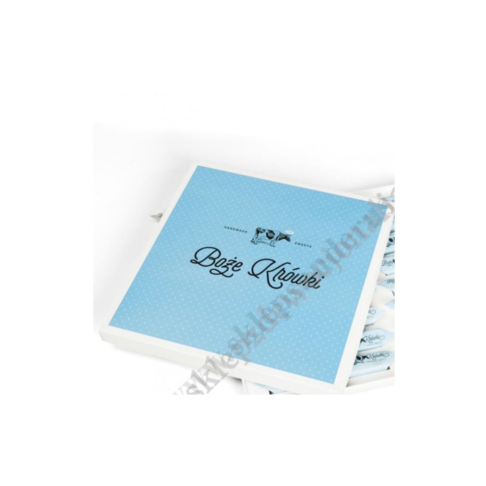 Wyjątkowa bombonierka dla najbardziej wymagających klientów, z wytłoczonym napisem Boże Krówki. Na naklejce pod spodem pudełka są umieszczone niezbędne informacje o produkcie.
