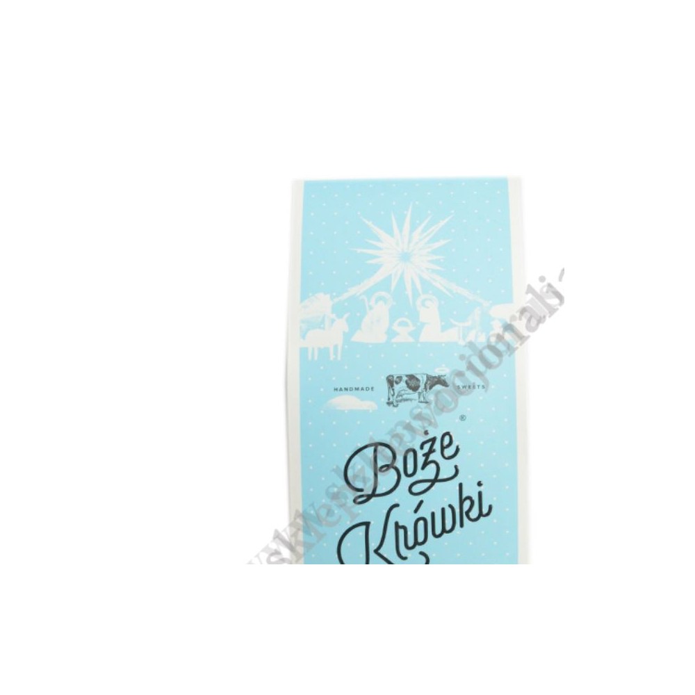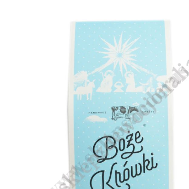 Elegancki kartonik z wytłoczonym napisem Boże Krówki, na którym umieszczone są niezbędne informacje o produkcie.