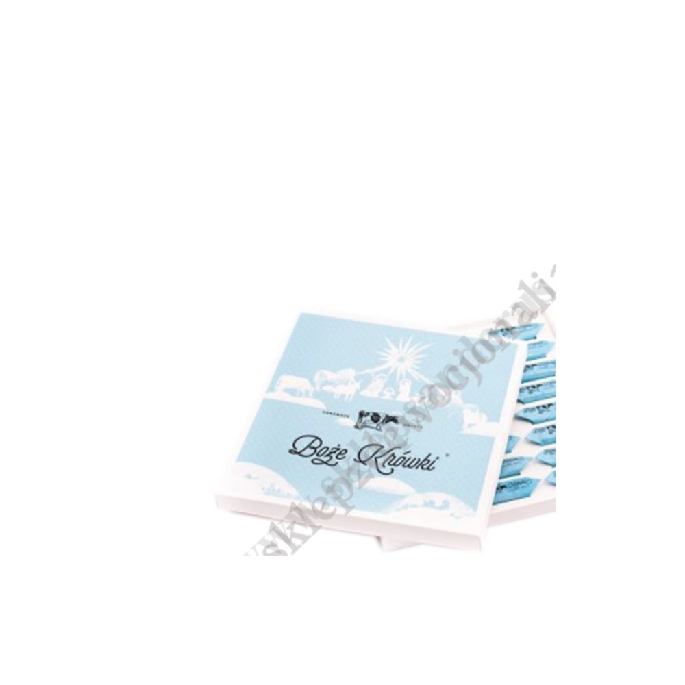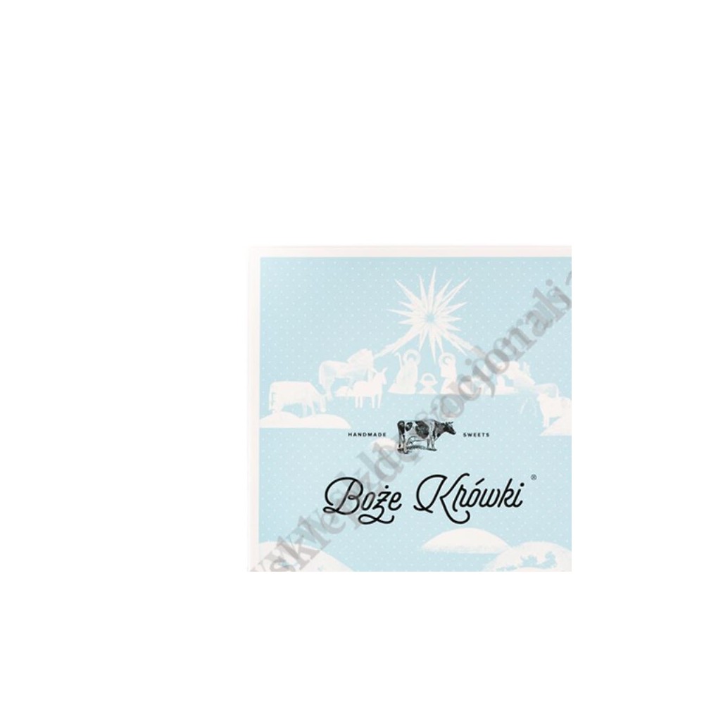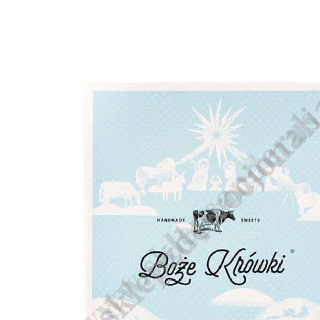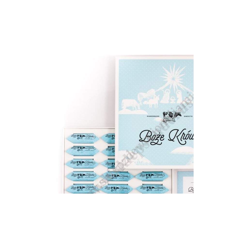 Wyjątkowa bombonierka dla wymagających klientów, z wytłoczonym napisem Boże Krówki oraz grafiką świąteczną. Na naklejce pod spodem pudełka są umieszczone niezbędne informacje o produkcie.