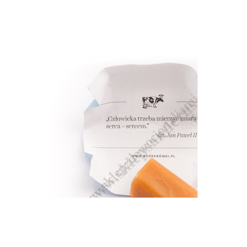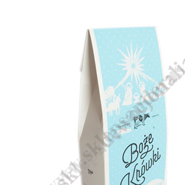 Elegancki kartonik z wytłoczonym napisem Boże Krówki, na którym umieszczone są niezbędne informacje o produkcie.