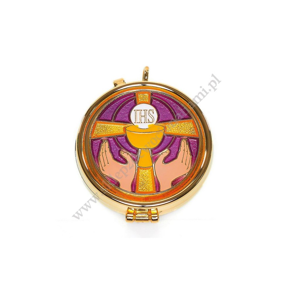 Cyborium metalowe, złocone. Wieczko ozdobione plakietką z kolorową emalią.