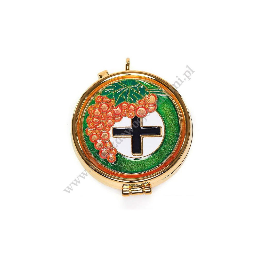 Cyborium metalowe, złocone. Wieczko ozdobione plakietką z kolorową emalią.