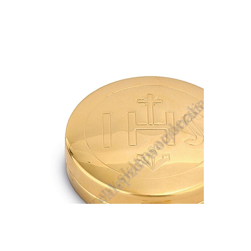 Cyborium metalowe z wygrawerowanym napisem IHS, pozłacane.